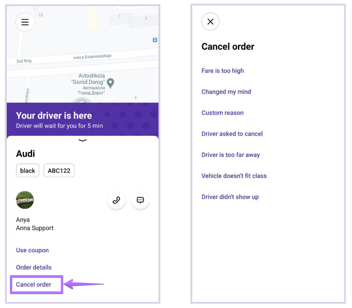 Annulation of the trips is a natural part of the taxi business. A long range of circumstances may force customer or driver to say “sorry, I should cancel it”. Our system resolves such situations as fair as possible. If customer wants to cancel the order, he or she should always press >> Cancel >> Specify the reason as per the screenshot below: