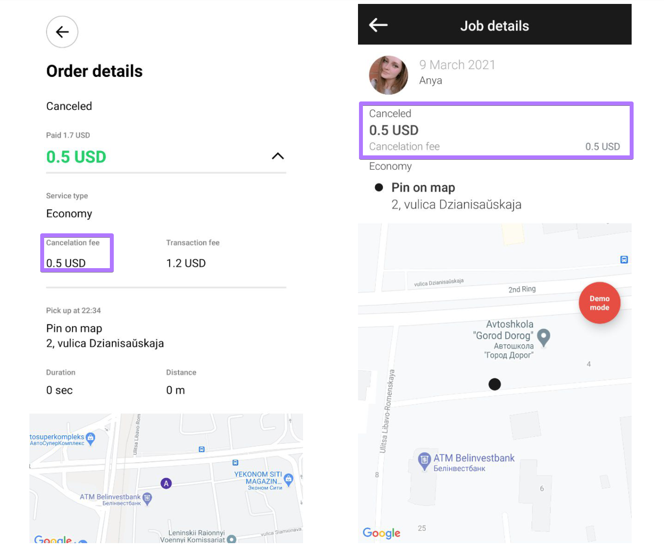 2. Cancellation fee also applies in cases when a "Min. driver’s wait time before they can cancel the order for free " runs out. Mind that "Min. driver’s wait time before they can cancel the order for free " countdown starts only once ETA = estimated time of arrival set by driver at order acceptance is over.