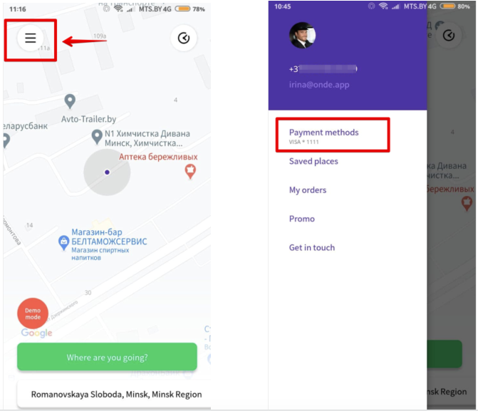 Tap on “More items” icon of your customer app and find “Payment methods” folder in your side menu list. Access the folder to add your first card.