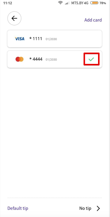 Every last added credit card is set as “Default”. This means that it will be charged at the end of the trip for services operating on credit card payment method.