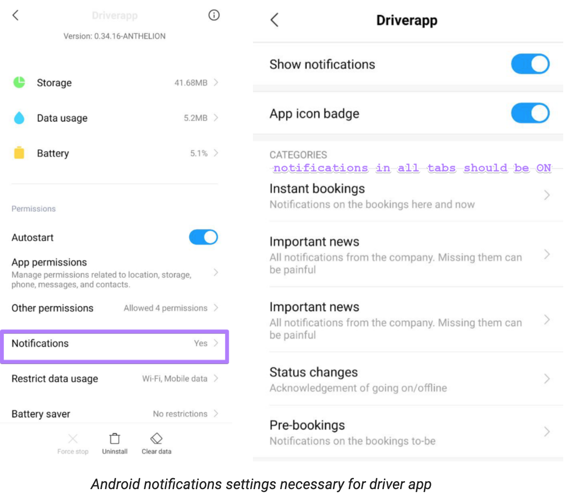 To get incoming jobs a driver must make sure all notifications on his smartphone are active. To check notifications a driver should proceed as follows:
