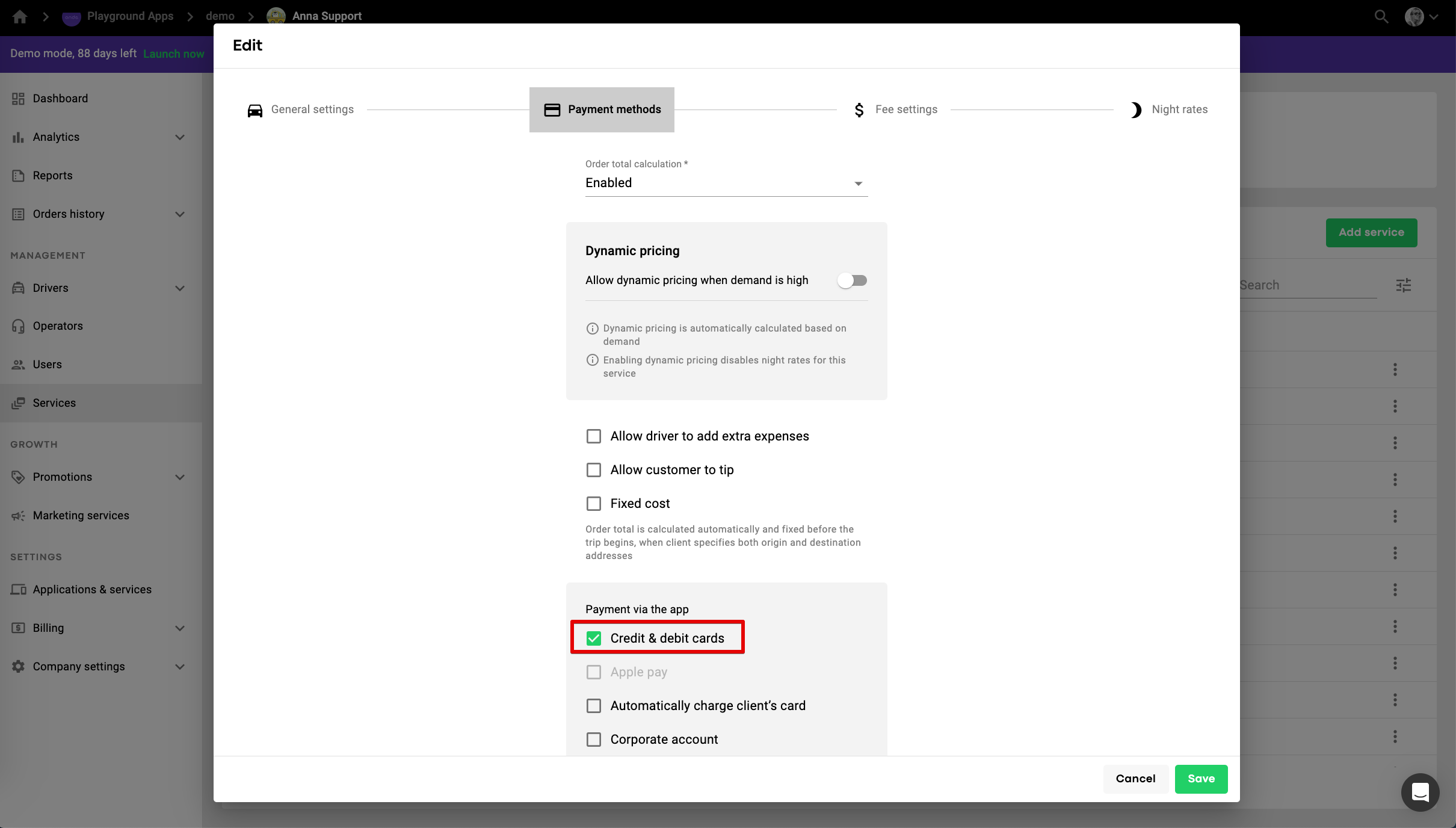 Go to My Hub, then to Services, add a new service ("Add service" button) or select the one that is already active. Go to 'Payment methods' and enable the option of payments with credit and debit card.