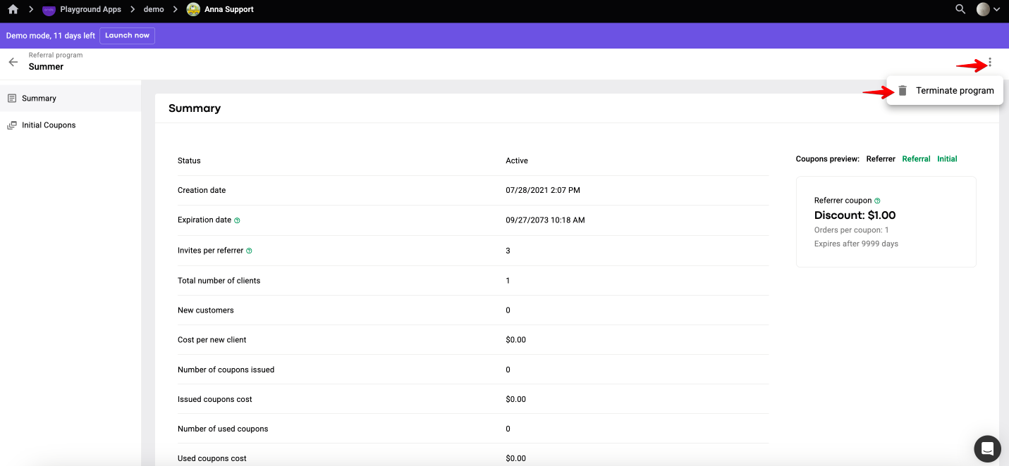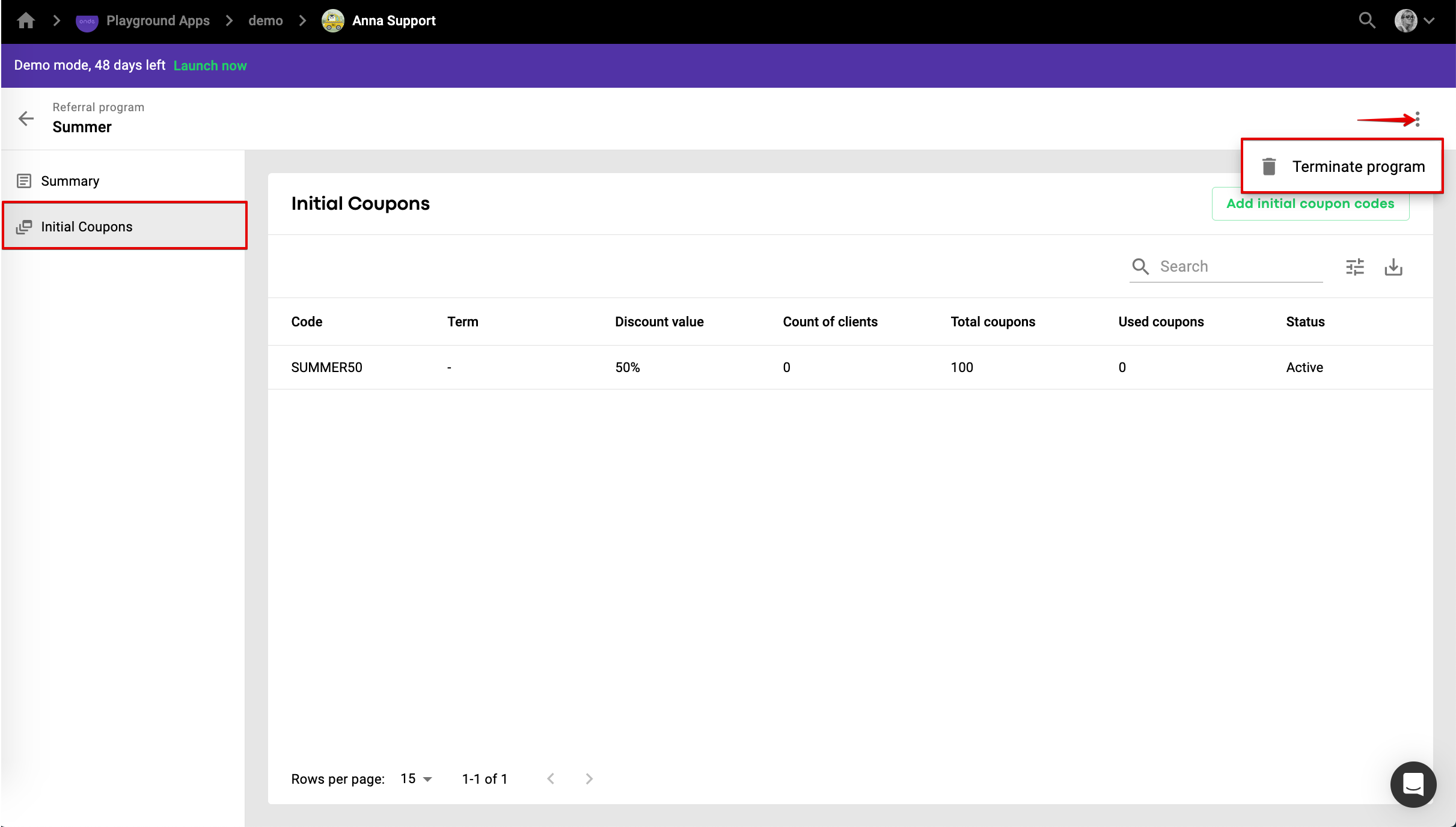 You can terminate a referral program by selecting “TERMINATE PROGRAM” in the menu of the top right screen corner.