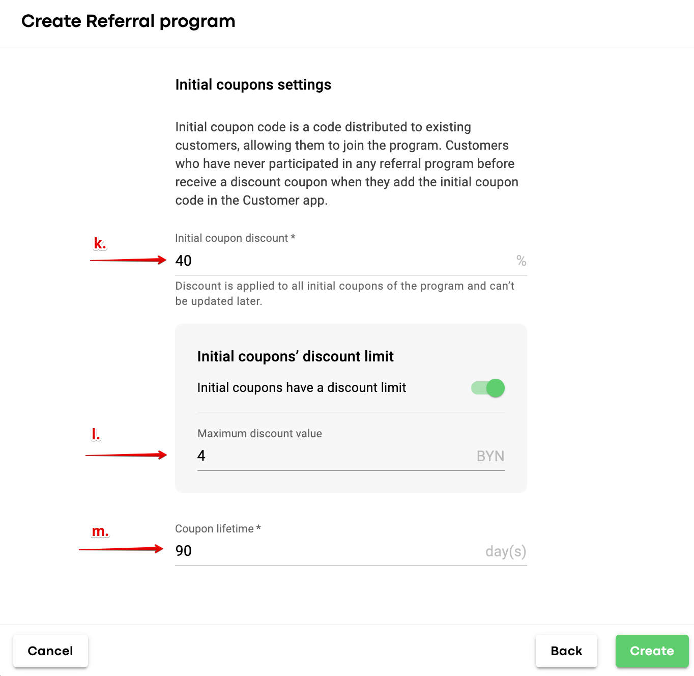 6. After the "Step 2" configuration press “Create”. The program will be created, however one still needs to add the first batch of initial coupons within step 3 (n).