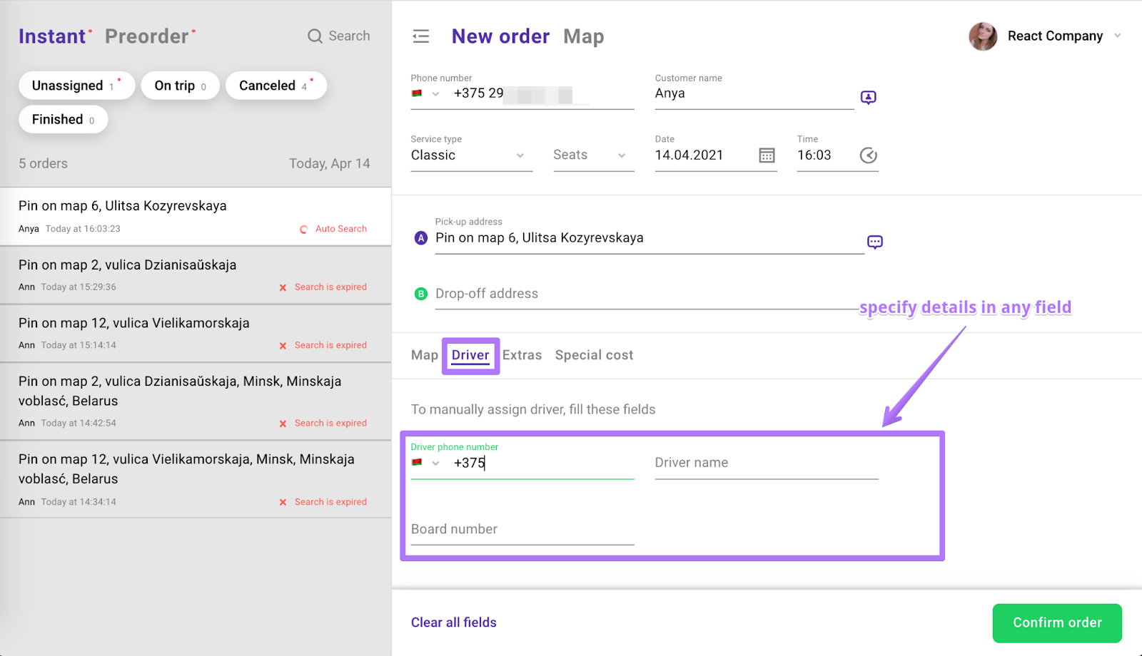 It's possible for the job to be assigned to the driver manually. For this it's necessary for you to specify driver's phone #, name or board #.