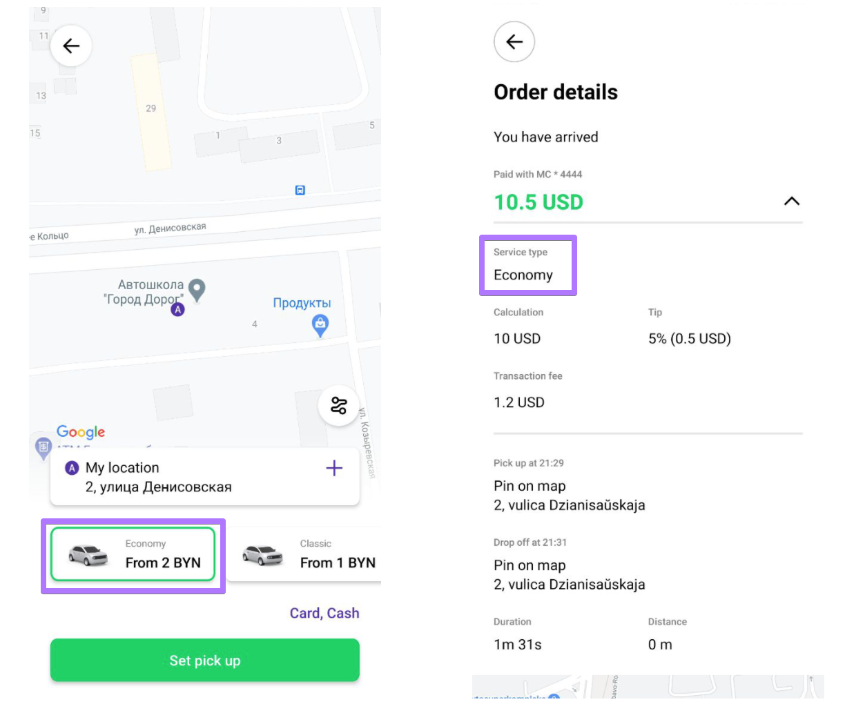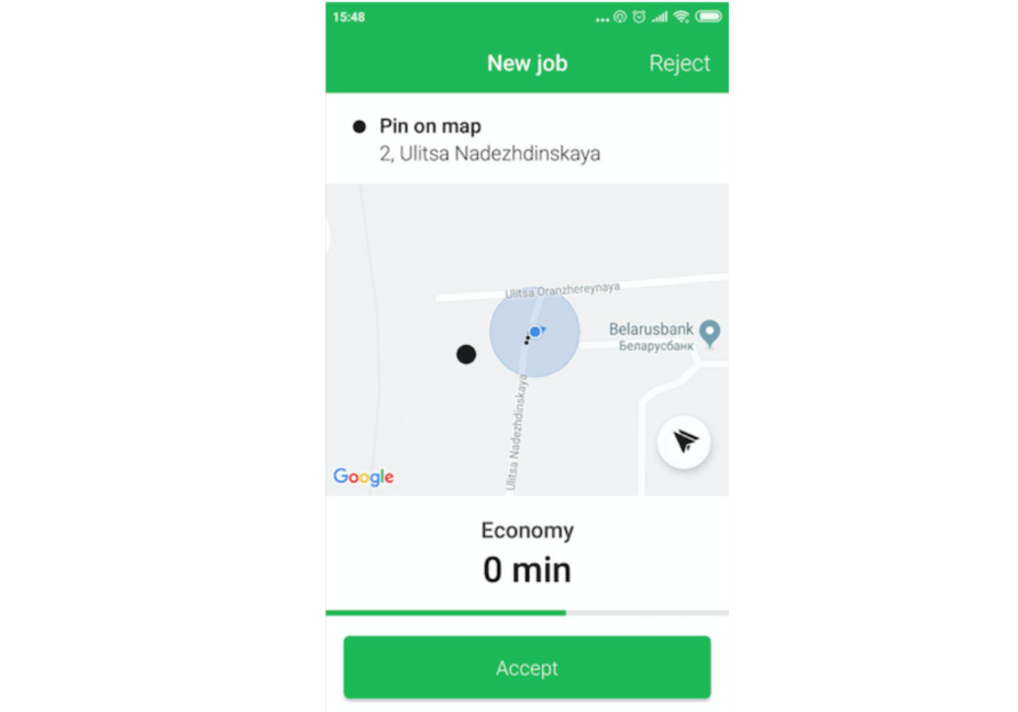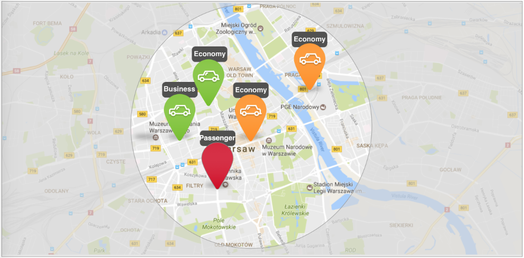 Let’s allow business service to receive jobs on the Economy rate. Once customer orders Economy cab, the system checks if there are any suitable taxis in the area. As we can see in the picture, there are 2 cars available: one Economy and one Business. The system will form a queue of these drivers depending on their karma, waiting time and ETA (please check our post intelligent queue algorithm for more details). The order will go to the first driver in the queue. If this driver ignores/rejects the order, it will be offered to the next driver in the queue.
