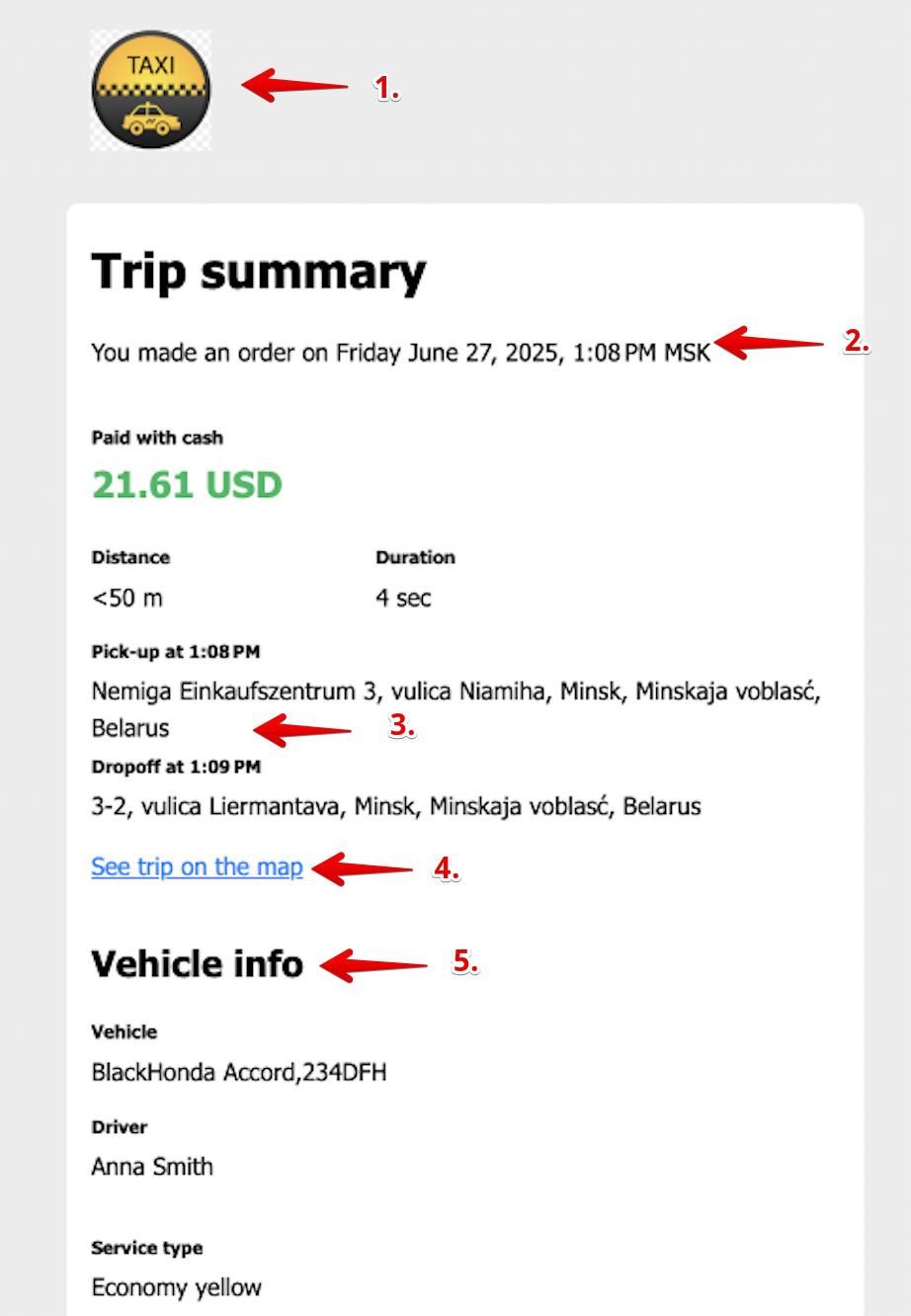 At the end of each order company, customer and driver receive a Trip summary with detailed information about the order. Driver and customer receive it on condition that email is specified in their profile. Trip summaries are sent only for finished and cancelled by customer orders.