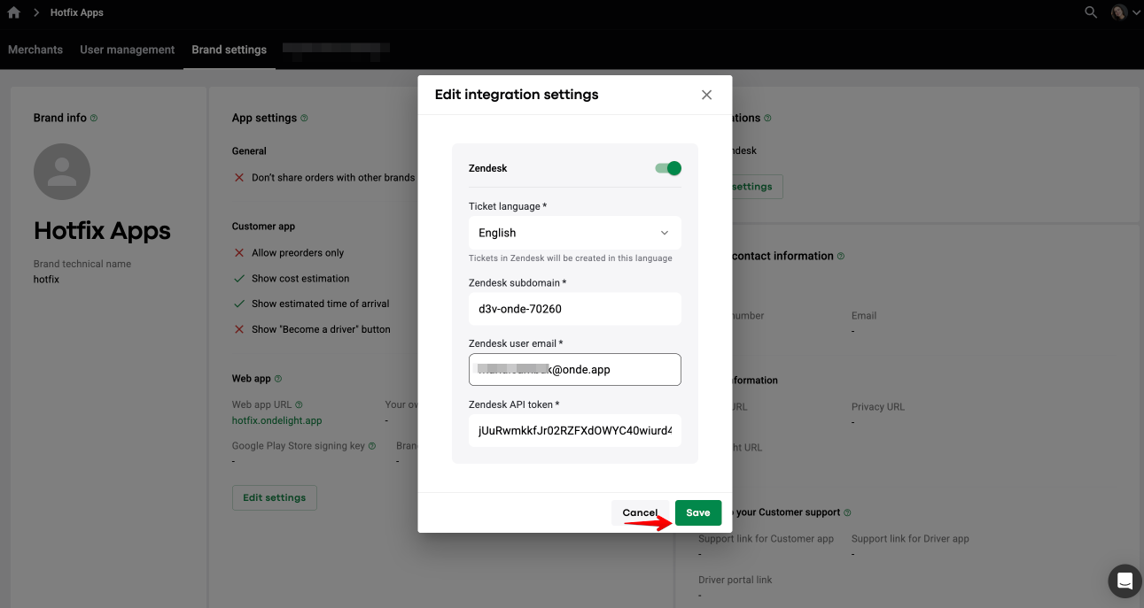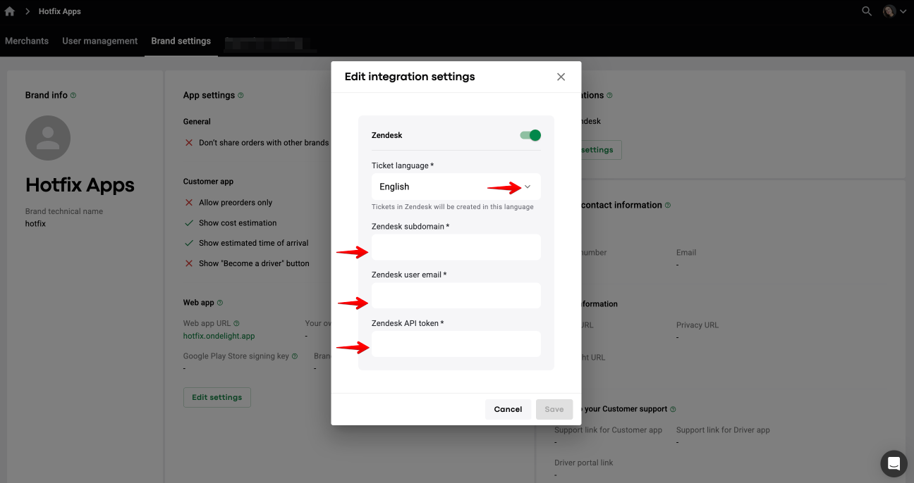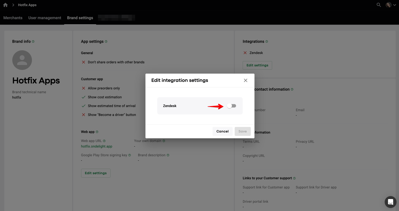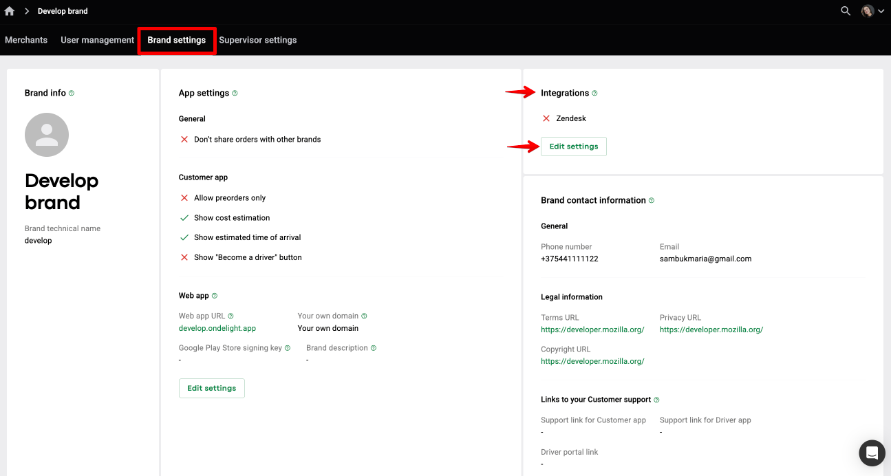 1. To enable the integration with Zendesk, proceed to Brands > Brand settings > find Integrations > tap “Edit settings”.