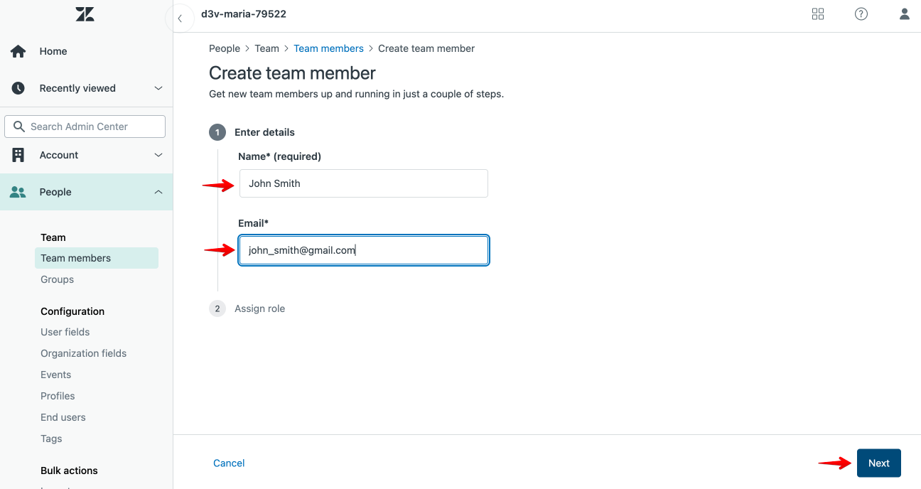 To add a new team member to the Zendesk account, proceed to Settings > People > Team members > Create team member and select the access role the new Team member will have.