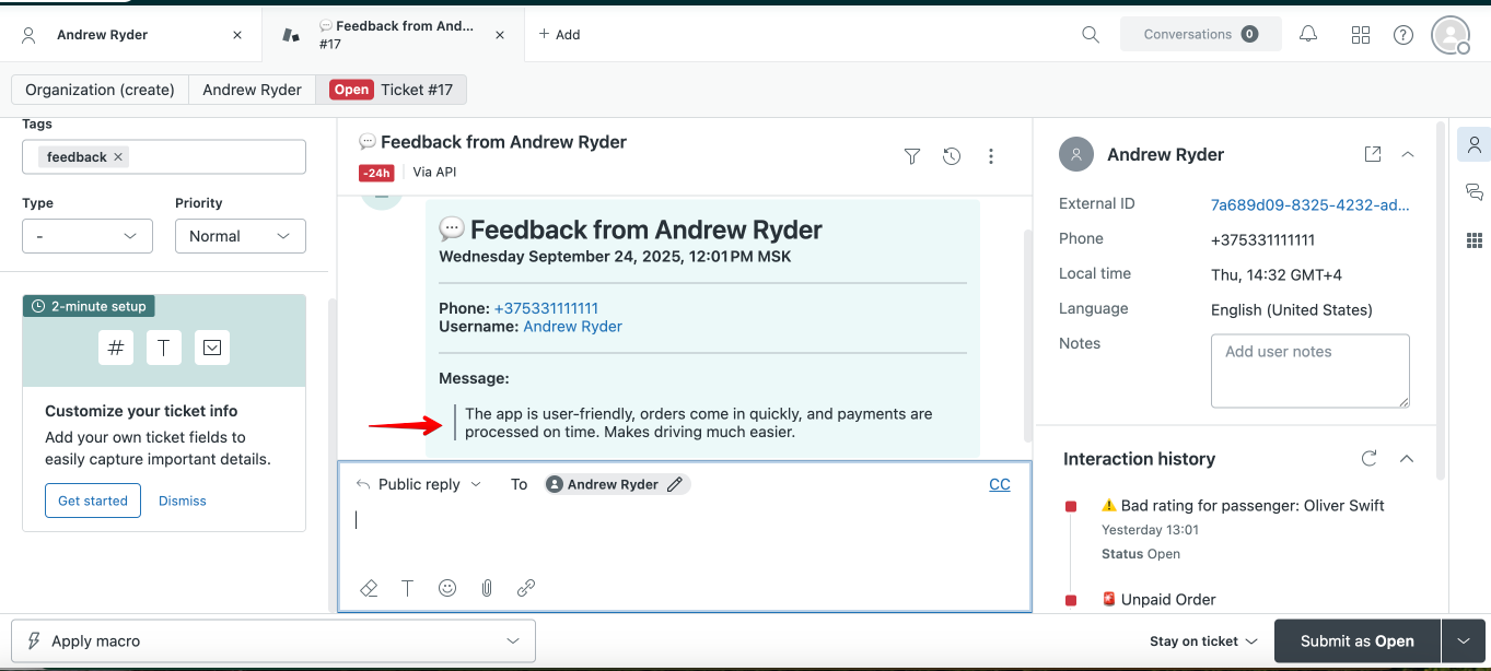 NB: "App feedback” tab in Customer and Driver apps is not available by default. In case a company wants their customers and drivers to send feedback to Zendesk, it should submit a request to support@onde.app