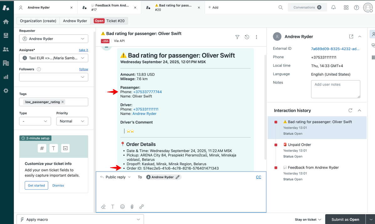 1. Bad rating for passenger (order ID is logged in the ticket)