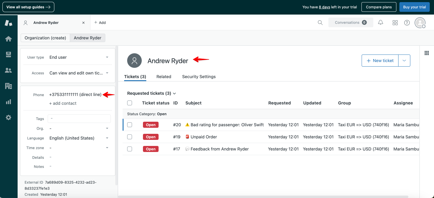 External ID in Zendesk ticket created by a user corresponds to Onde internal user Profile ID, which can be tracked in the Driver/Clients report.