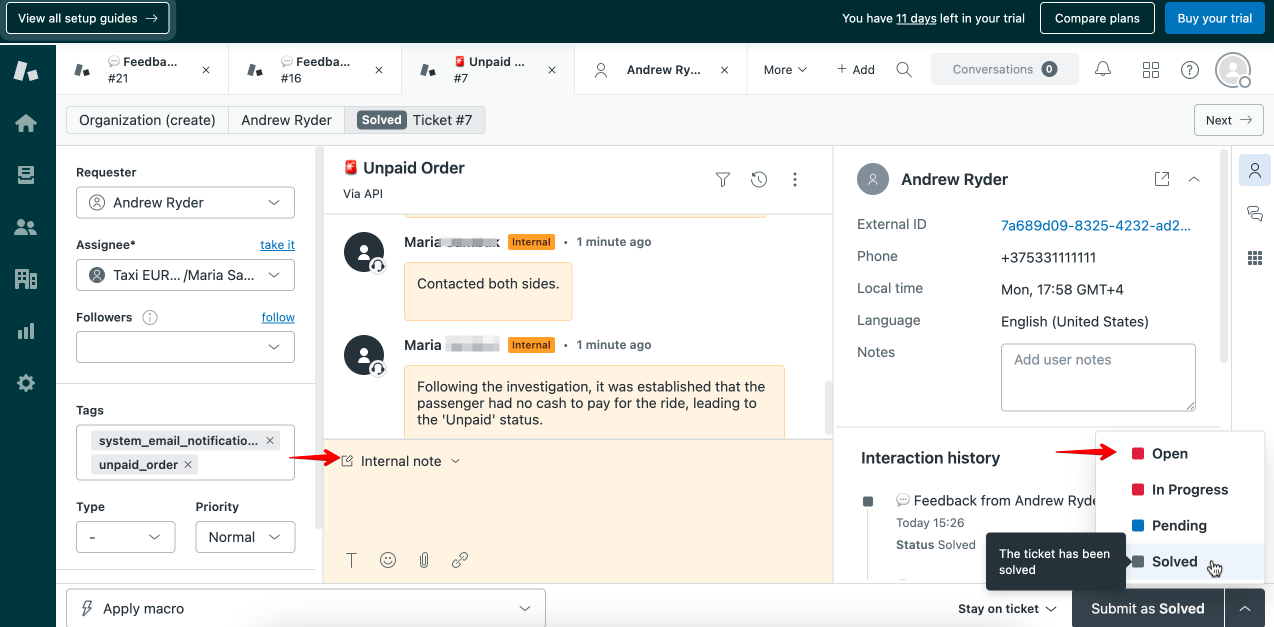 Team members can manage tickets inside Zendesk by adding internal notes and changing ticket statuses.
