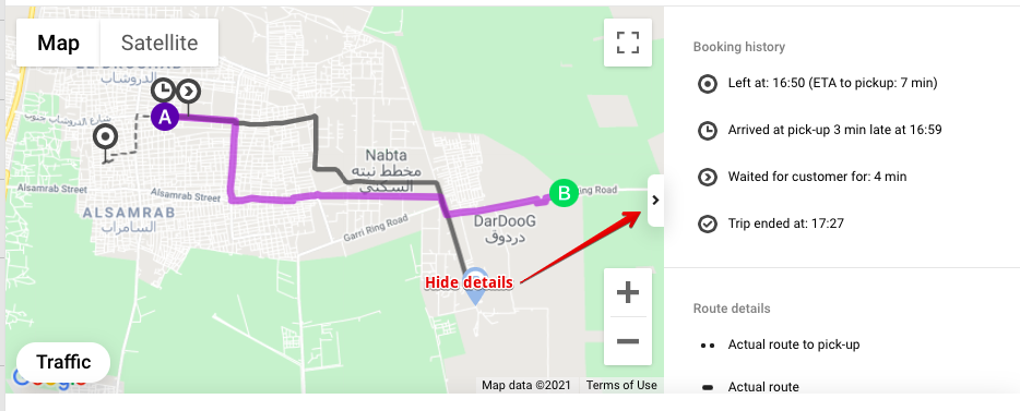 “Booking History” is stored in the top right corner of the map. Both booking history and route details can be hidden and shown again by pressing on the arrow button:
