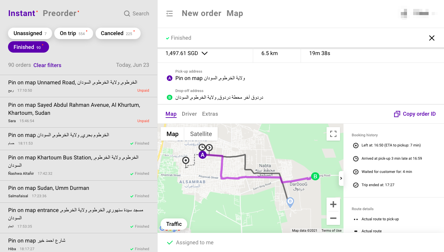 - Shows when and where the driver “Accepted the order” (for instant orders) or swiped "Start a ride" (for pre-orders).