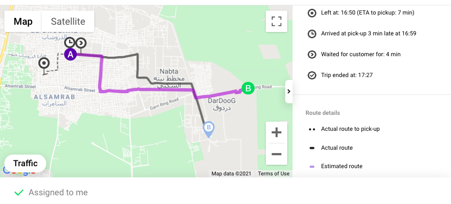Actual order route - a solid black line on the map that displays the real route of the trip from the point where driver swipes to “start the trip” (A) to the point where a driver swipes to “finish” (B)