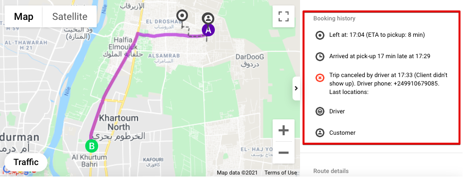 “Booking history” is a log of all trip statuses and their timing. It is realized via pictograms which upon clicking transfer to a specific point during the trip (pin on the map).