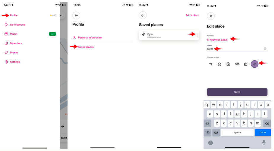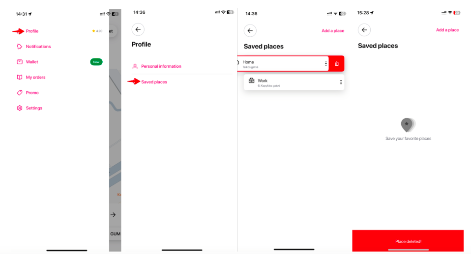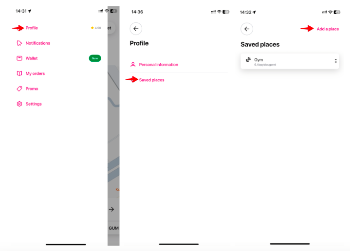 b. How to add a “Saved place” from the tab “Profile” in the side menu of the app.