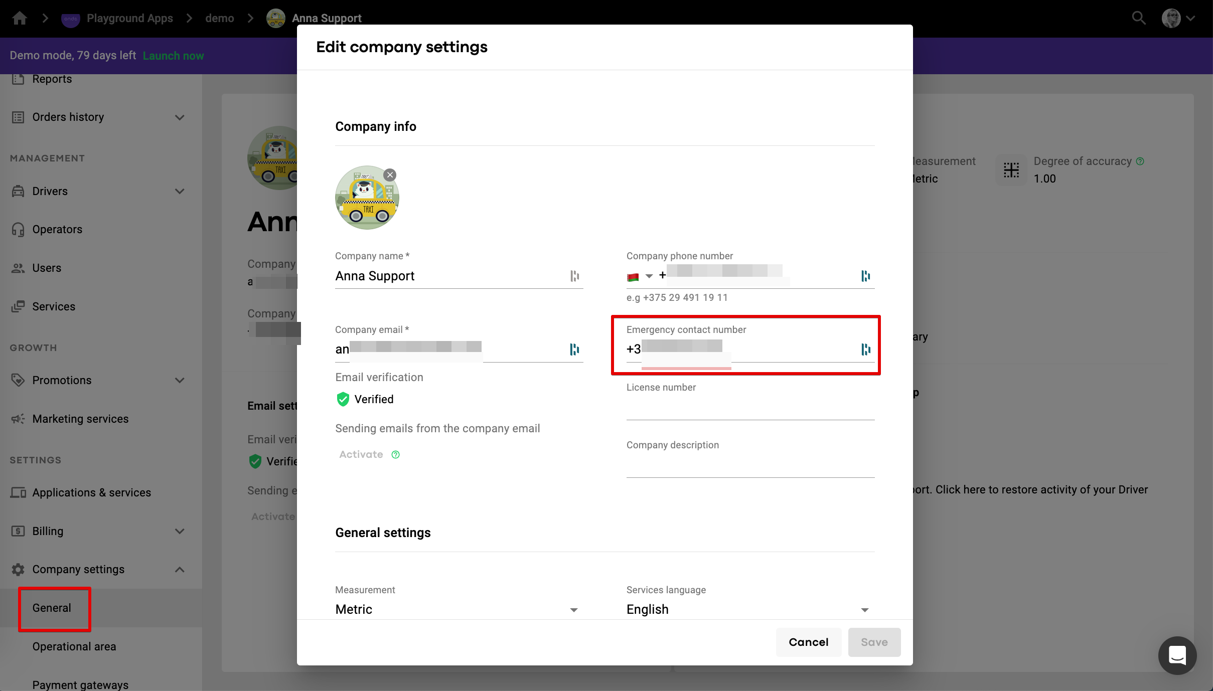 2. register the required number in the field “Emergency phone number”