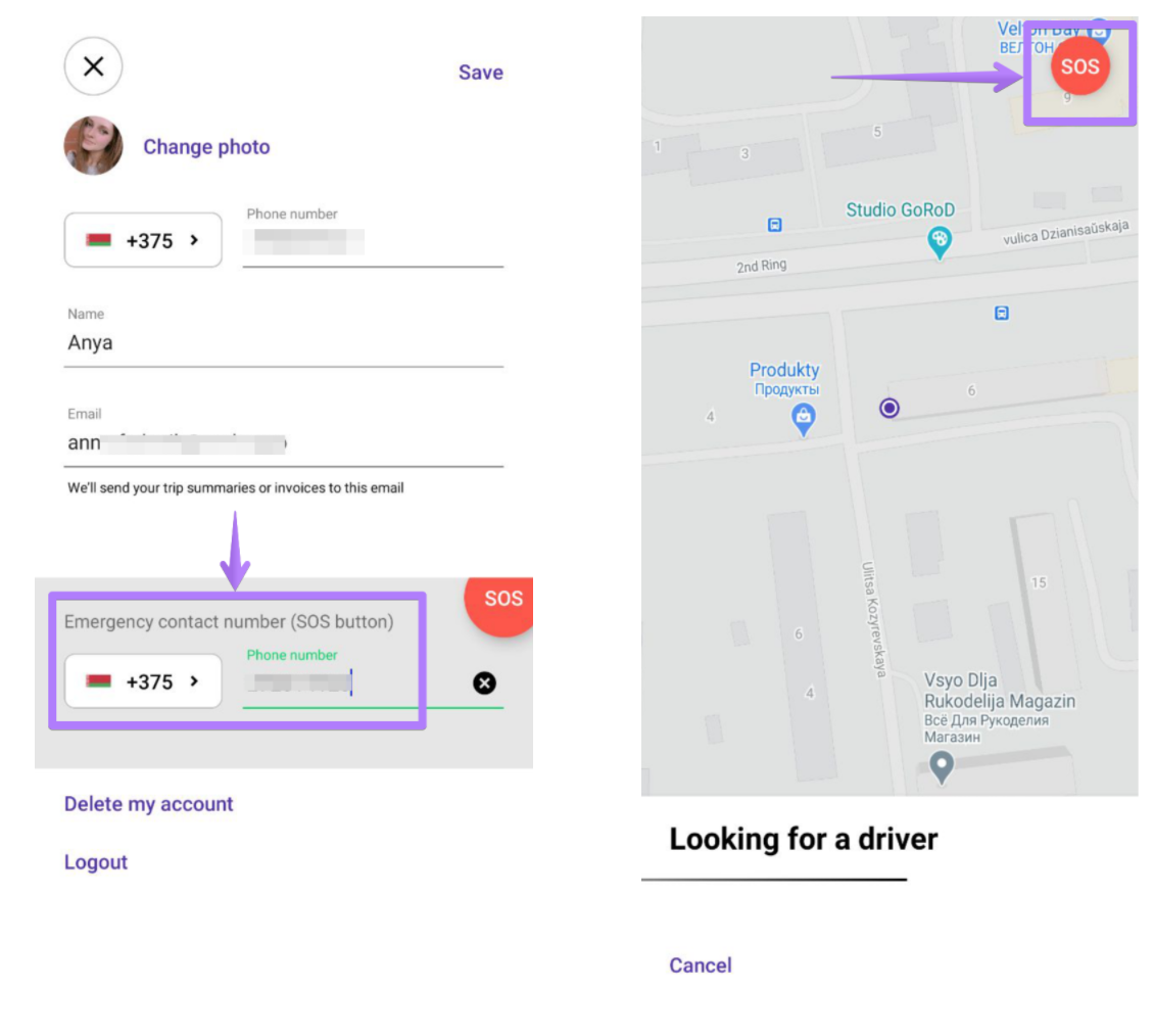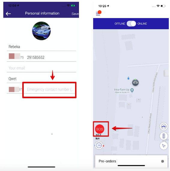 The number should be introduced in international format with a proper country code. Once a customer sets his own profile emergency number it will be available upon click on SOS button located on the main screen of the app. SOS button will appear from the moment the order is created till the order is completed.