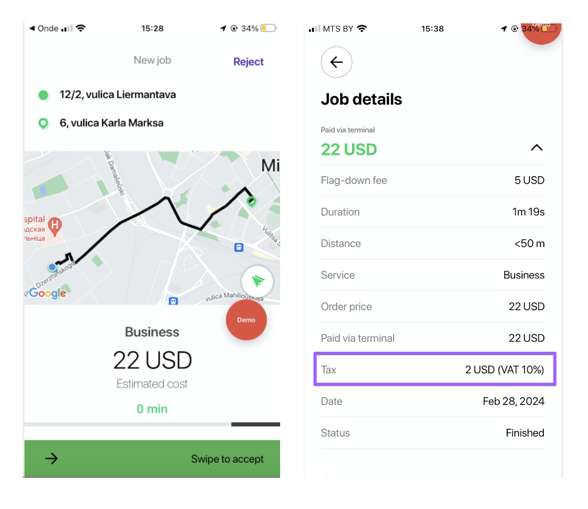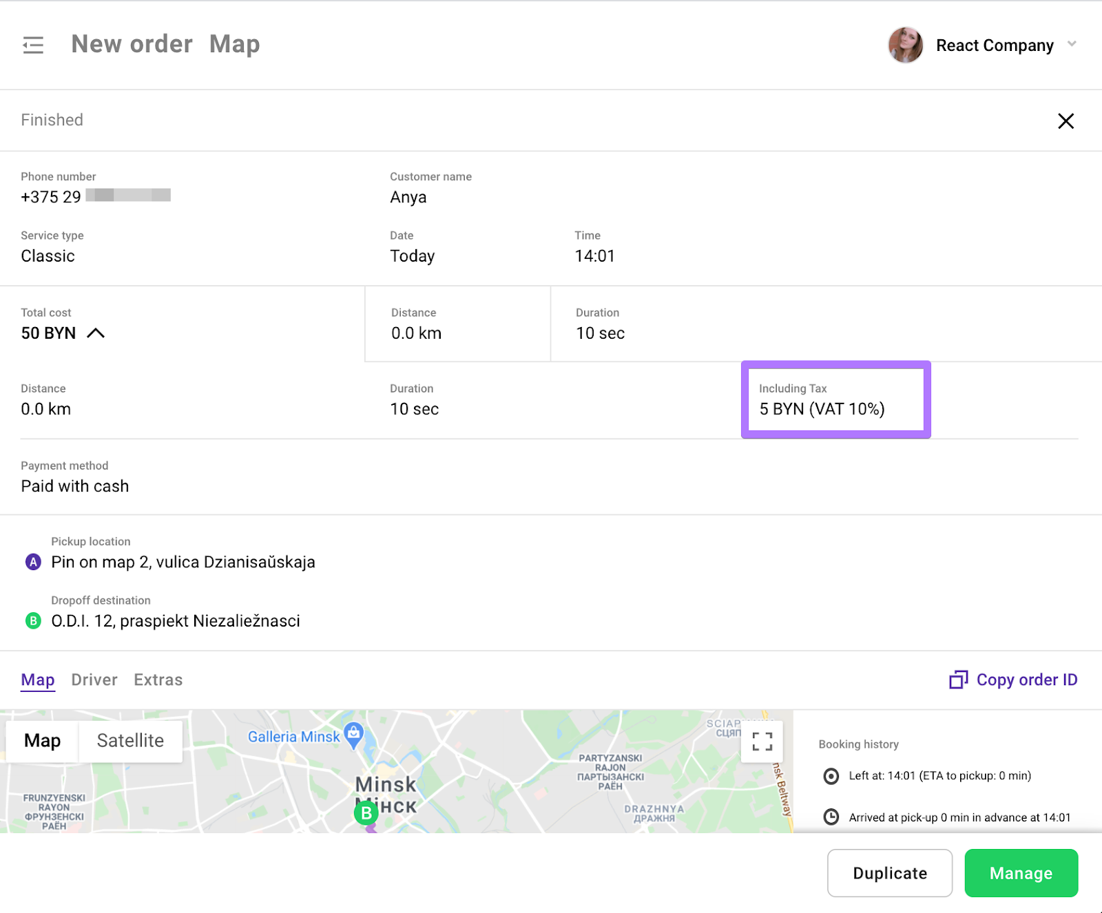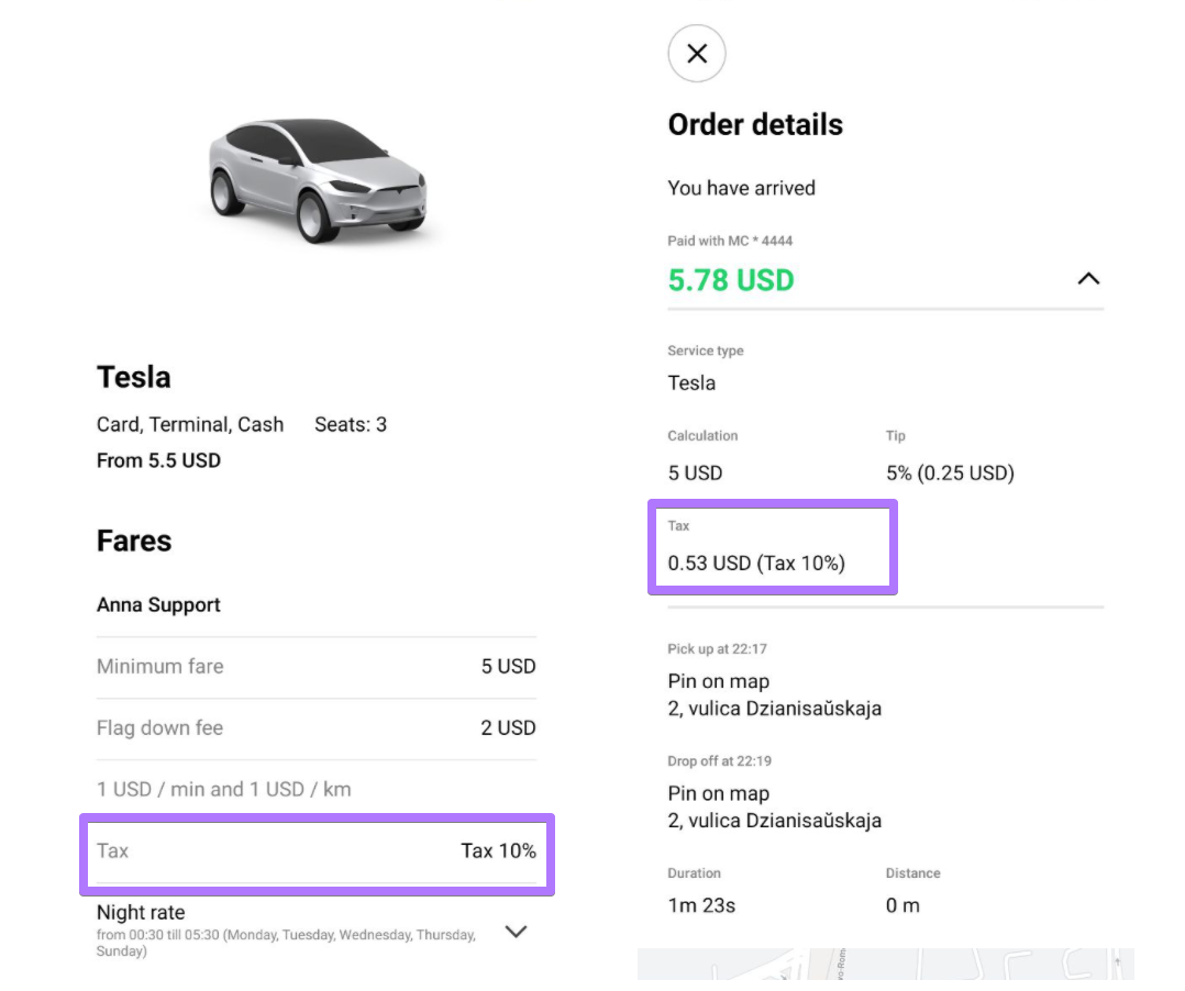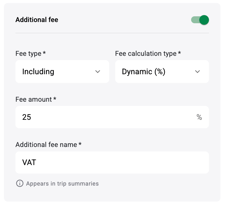 Fee notification will be shown to customers/drivers/operators before the trip and is registered as an extra line in Trip receipts/booking history for customers, drivers, operators and company. For ex: “Additional fee 10%, VAT is added on top of the trip cost”