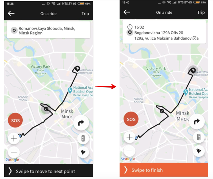 A driver has to swipe to confirm arrival to the intermediate drop-off and “Swipe to move to next point” following the same logic till the end of the trip.