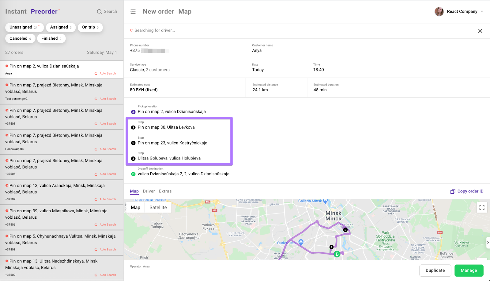 Operator app order with multiple drop-off :
