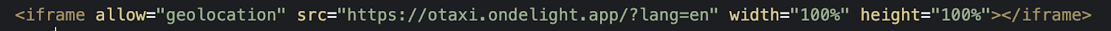 Example: let's say my company's name is Otaxi. I have my branded customer app accessible with the url https://otaxi.ondelight.app/. I need just inject Iframe with Web App branded url into my page HTML markup. Like this: