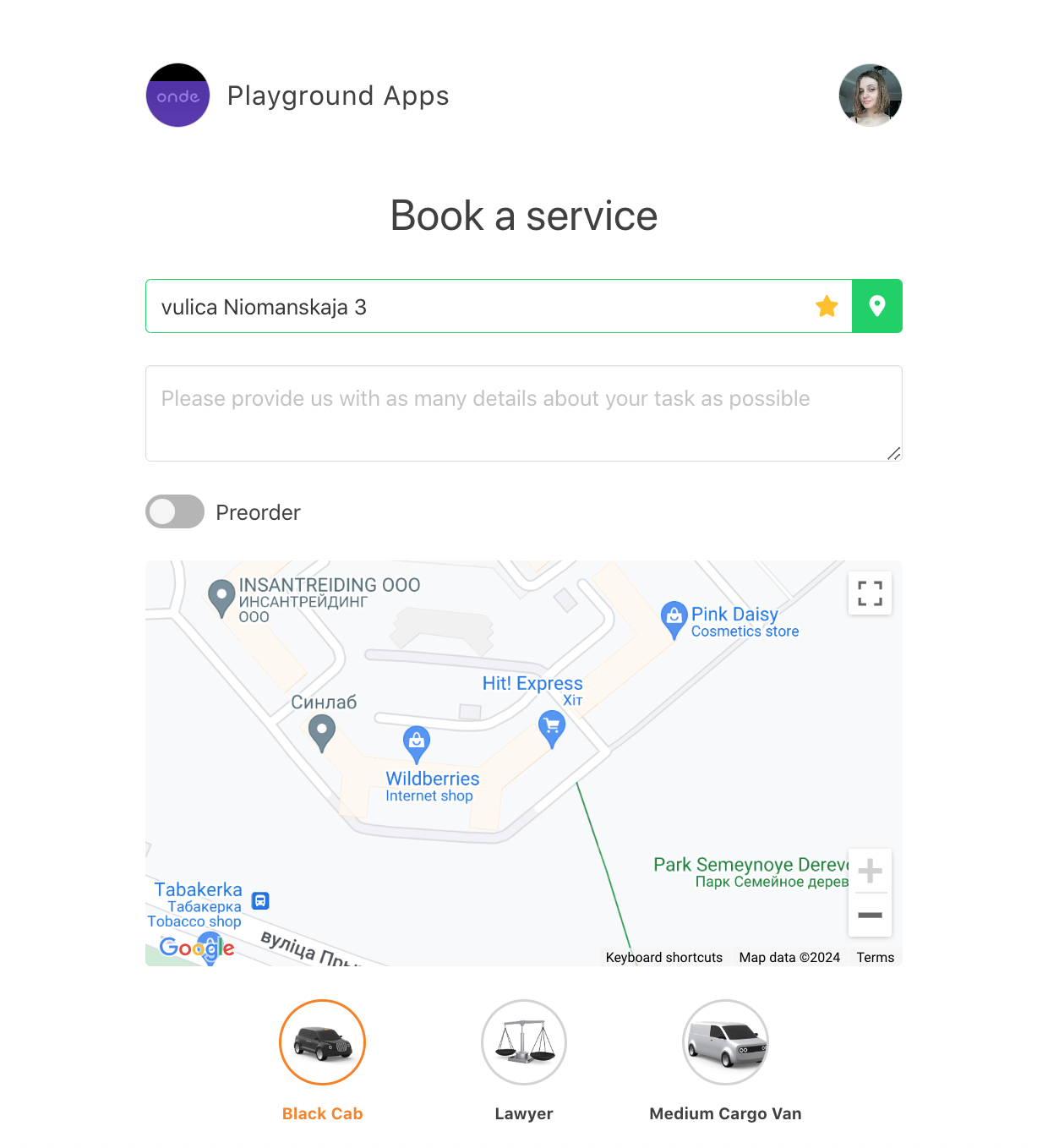 For on-demand services with no drop-off address you can add /service/ at the end of your branded Web app URL. It will make the interface of a booking widget a bit different to suit on-demand business model. For example: https://demo.ondelight.app/service/.