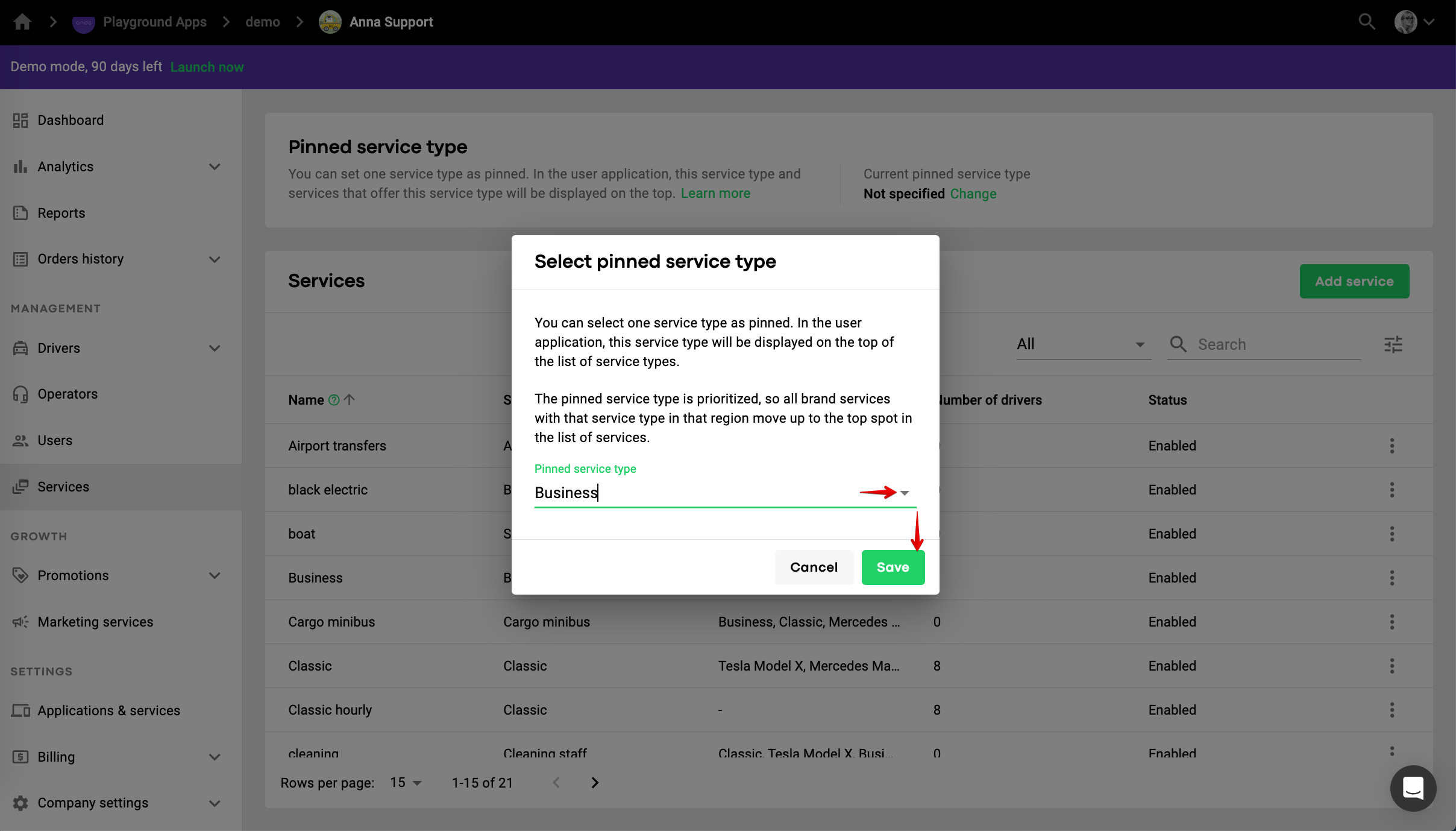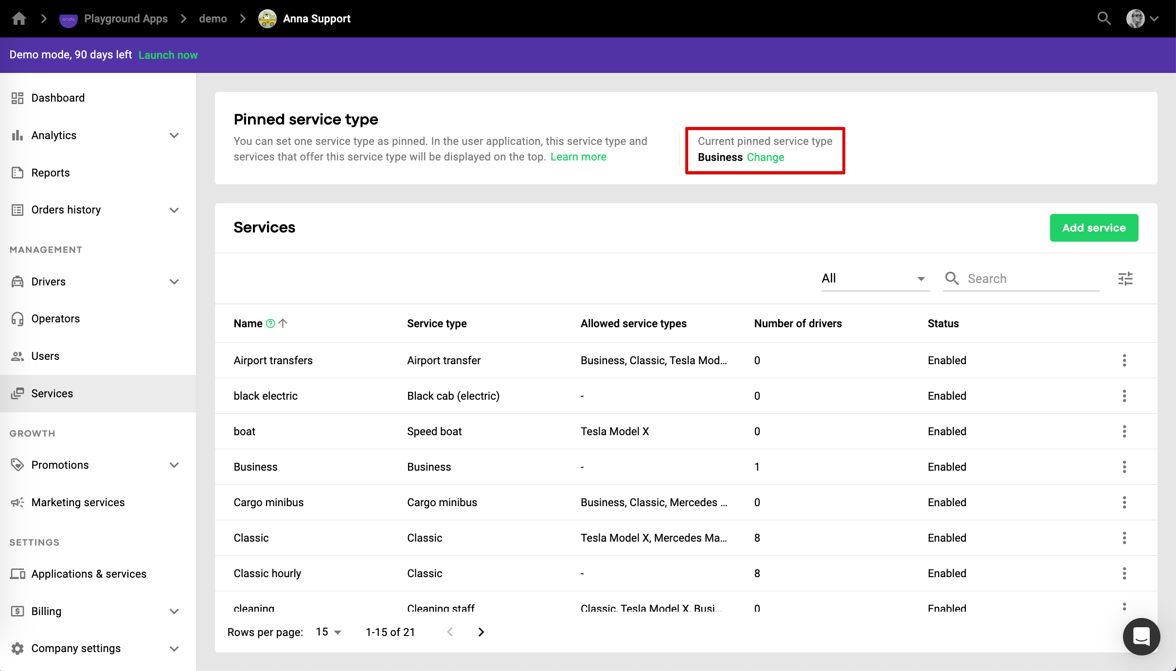 One can select 1 service type for each network company in their brand that will always appear first in Customer app. To do that access your Services > hover over to “Current pinned service type. Not specified. Change > Select pinned service type from the drop down list of available services and press SAVE