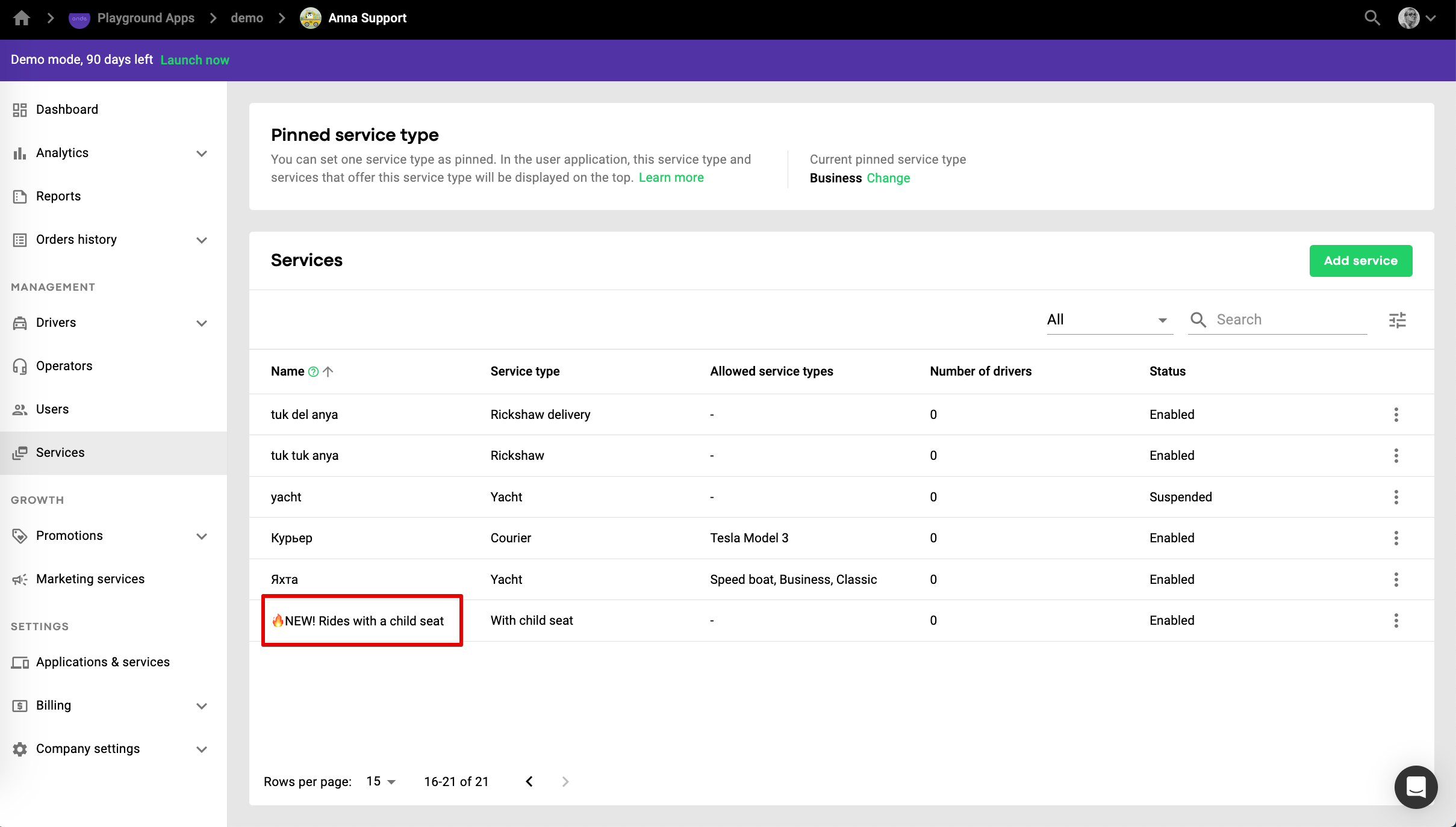 One may give a pinned service type a custom name to highlight the new service, promotion service discount, etc. Service type custom name is displayed on condition that the company has only one service on this service. In case there are several services within one service type the default name is displayed.