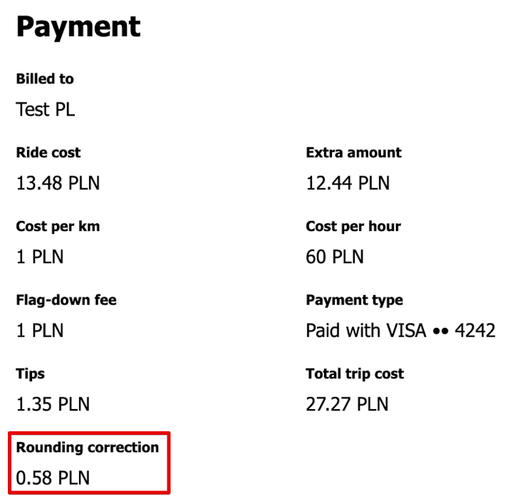 By default rounding correction is displayed to both customers and drivers and is logged in Order details of both apps as well as Trip summary.