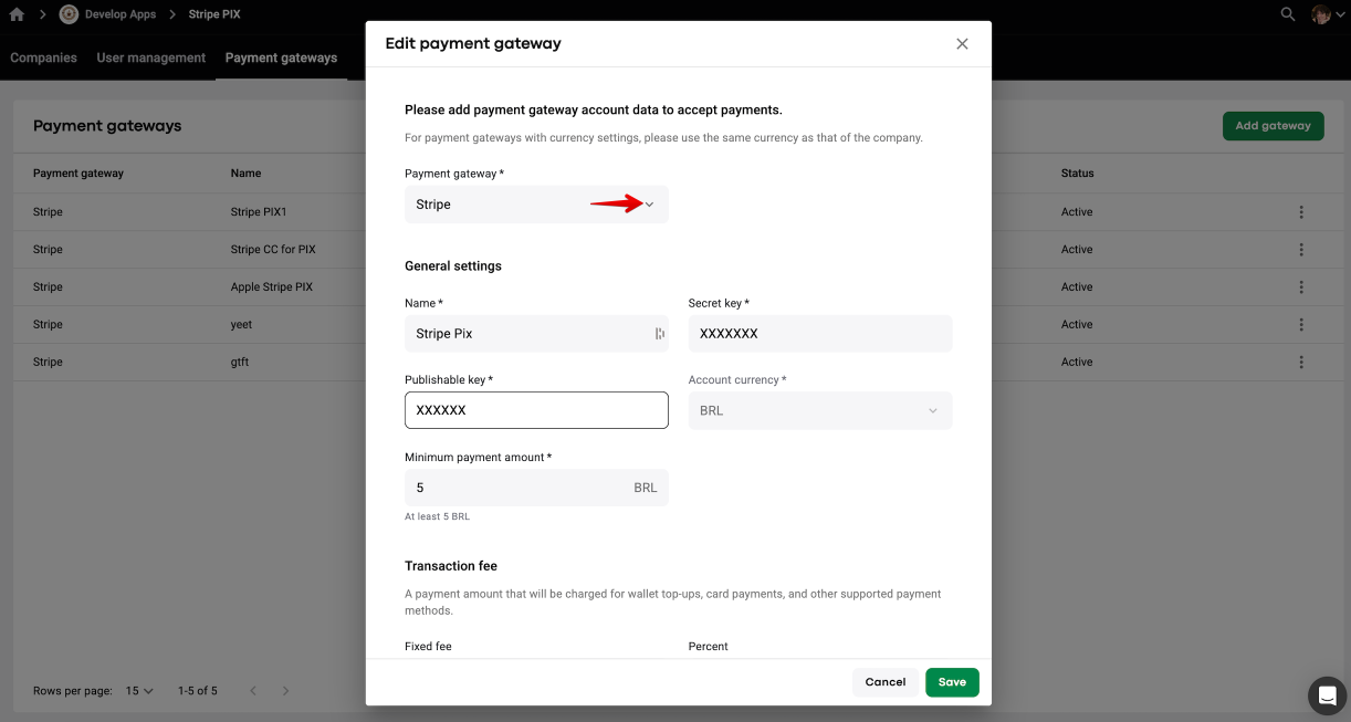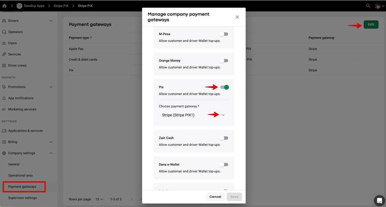 Once that is done, proceed to My Hub > Company Settings > Payment gateways > Edit > enable Pix in "Wallet top-up only" section > in the drop-down list select the Stripe account added to your merchant.