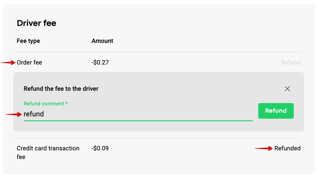 Upon access to the order details, a manager can review all the fees the Driver has been charged for in “Driver fee” section and affect the refunds.