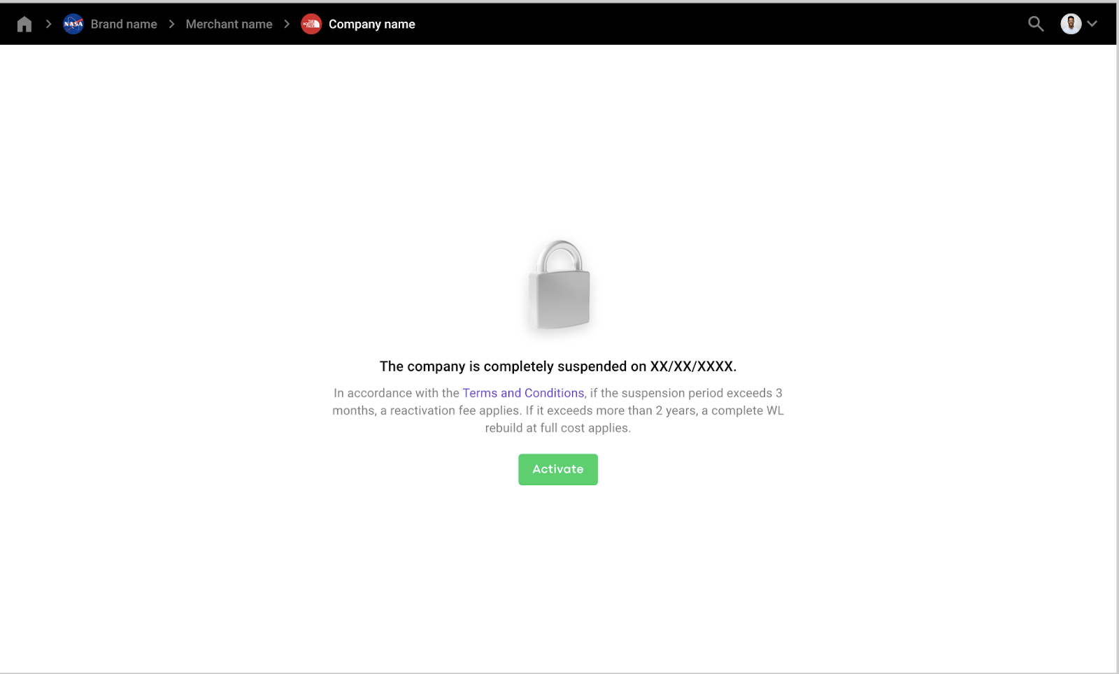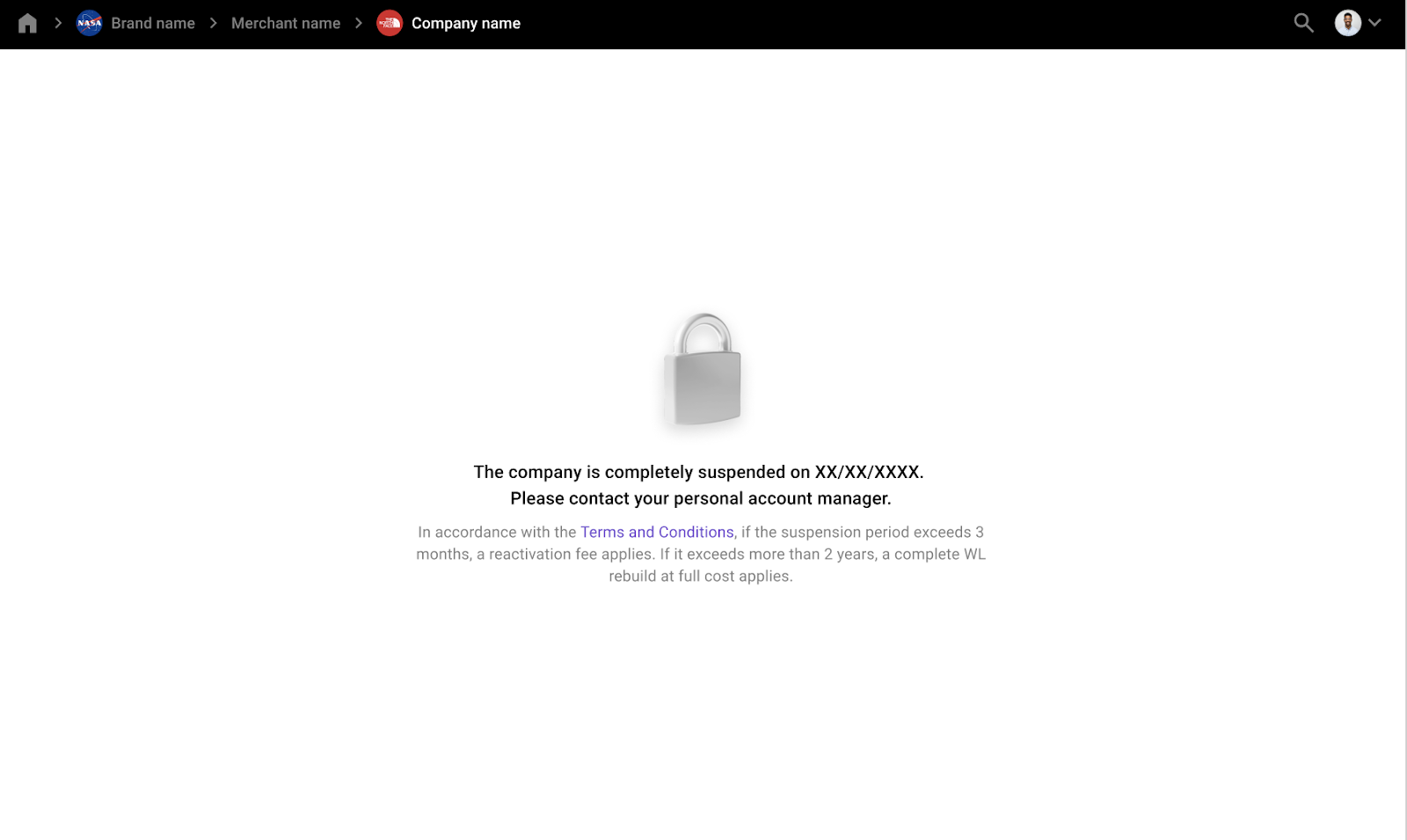 Any “Full access” user can reactivate the company. However, depending on the suspension period, reactivation fee or even new WL fee might apply.If a Company is manually suspended by a “Full access” user, the below message is shown to a manager with with a “Finance and Accounting” role: