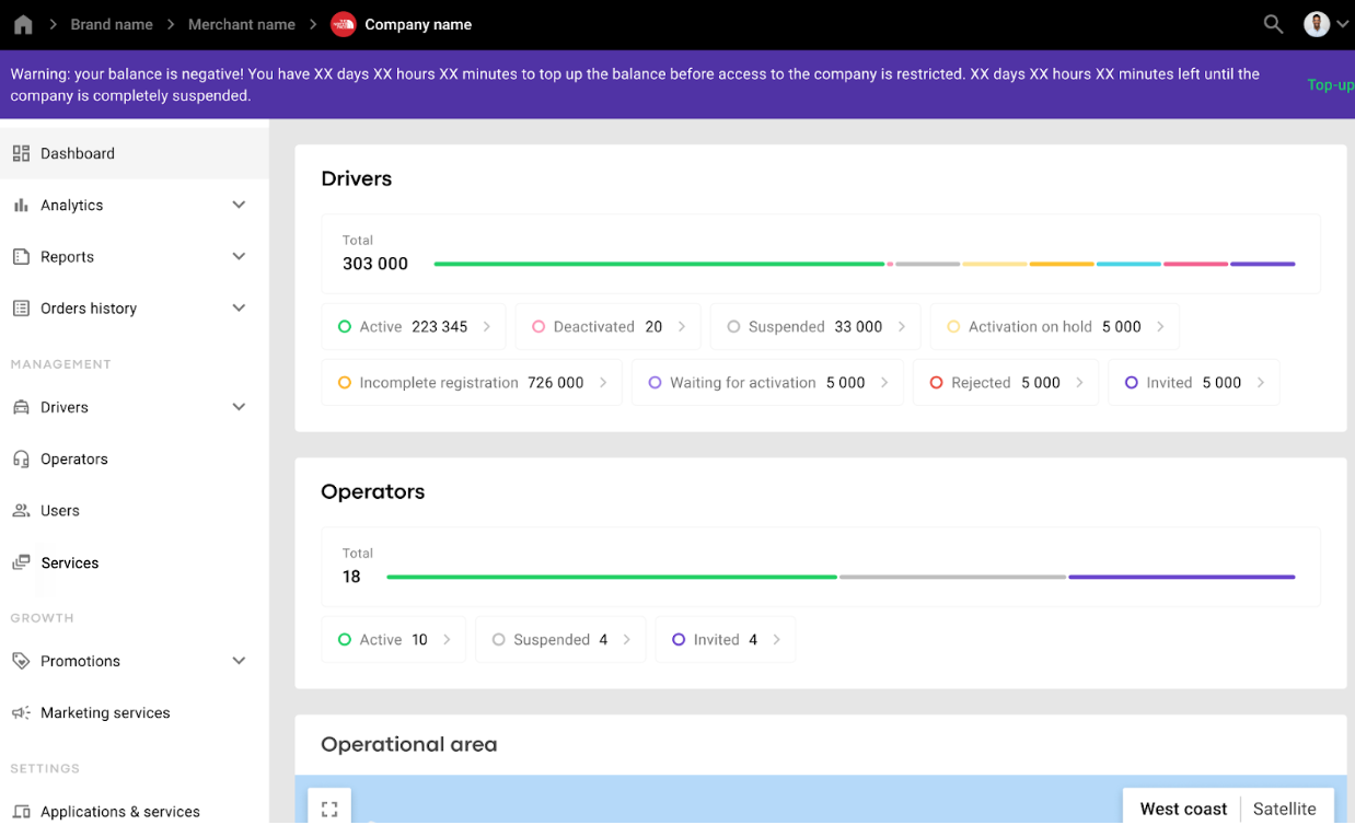 To sum it up, once the balance drops below 0, there are 14 days till company operations are suspended (unless the debt is covered), 7 of these days the company will still operate (drivers will process orders) but Company users will have no access to company.