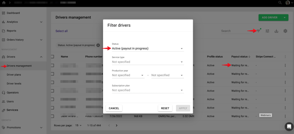 NB: Payout status of the drivers who have not sent their Payout details for review or failed to provide all the payouts documents is "Incomplete".