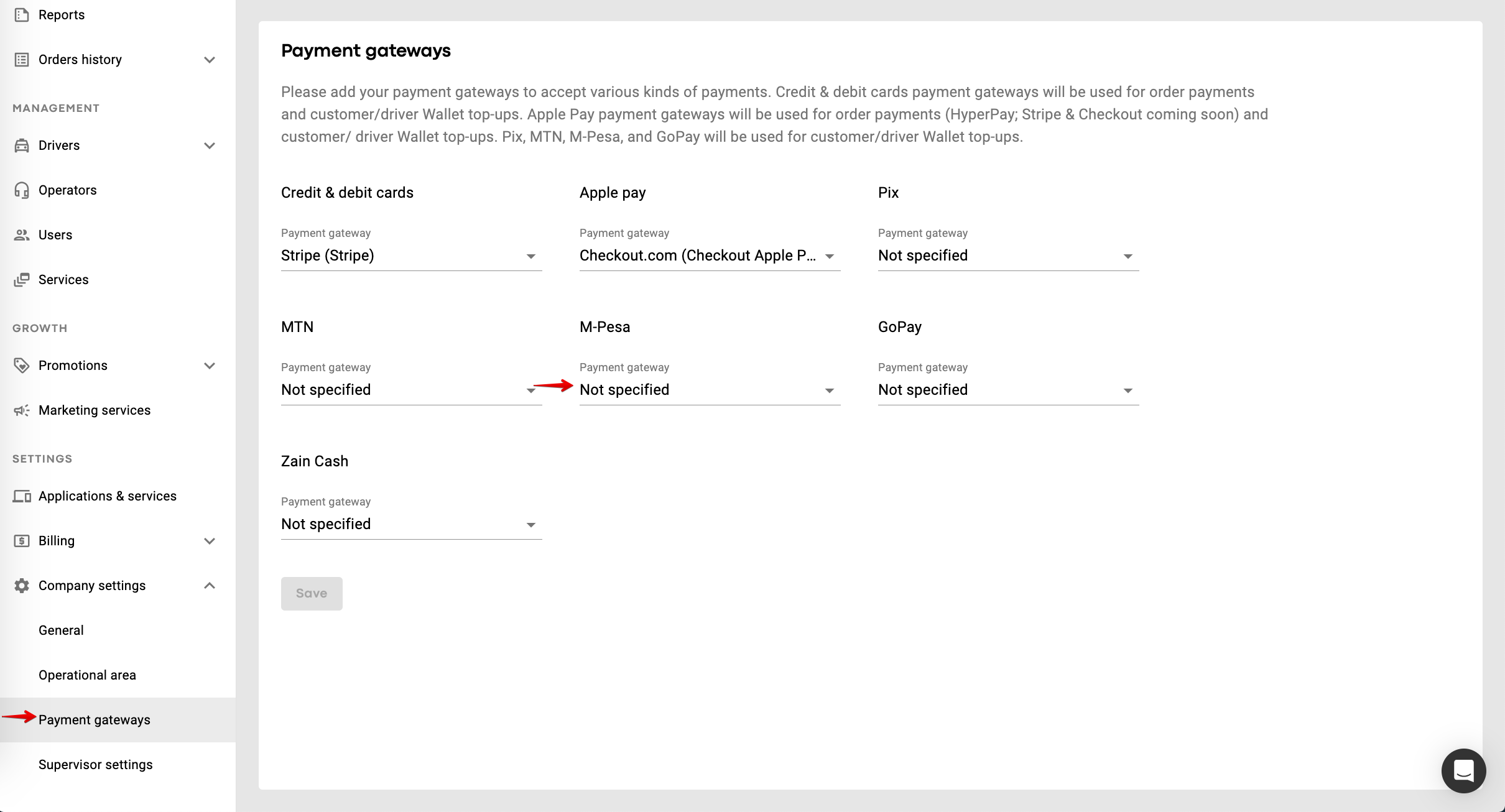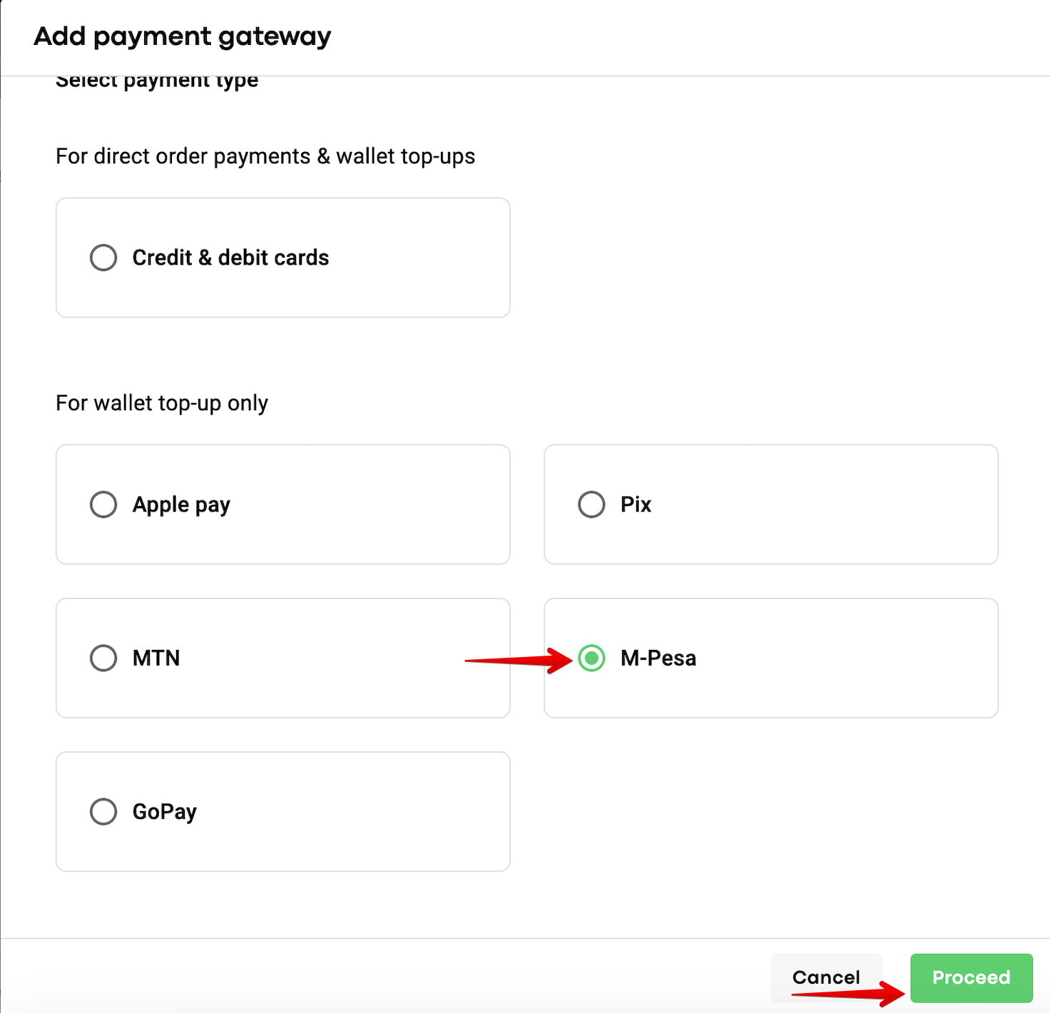 To add M-PESA for Сustomer wallet top-ups, proceed to the tab “Payment gateways” > select M-PESA in “For wallet top-up only” > tap PROCEED > choose Flocash from the drop down list of payment gateways, fill out all the keys and tap “SAVE” to finalise.