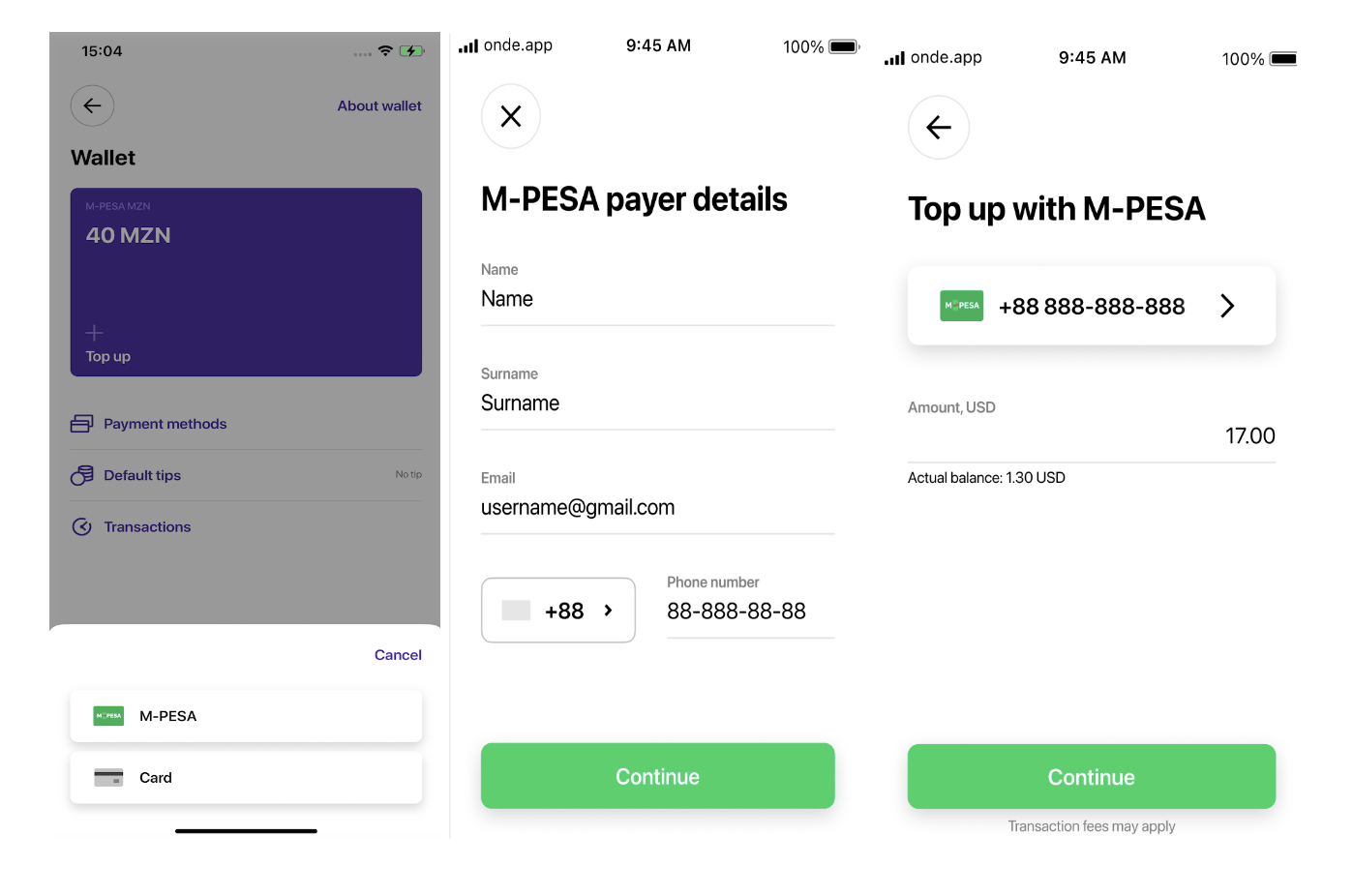M-PESA allows for a fast and efficient Customer Wallet top-up. It is a great alternative to regular card top-up as one does not have to add any cards to in-app Wallet but rather use the balance of their M-PESA account.