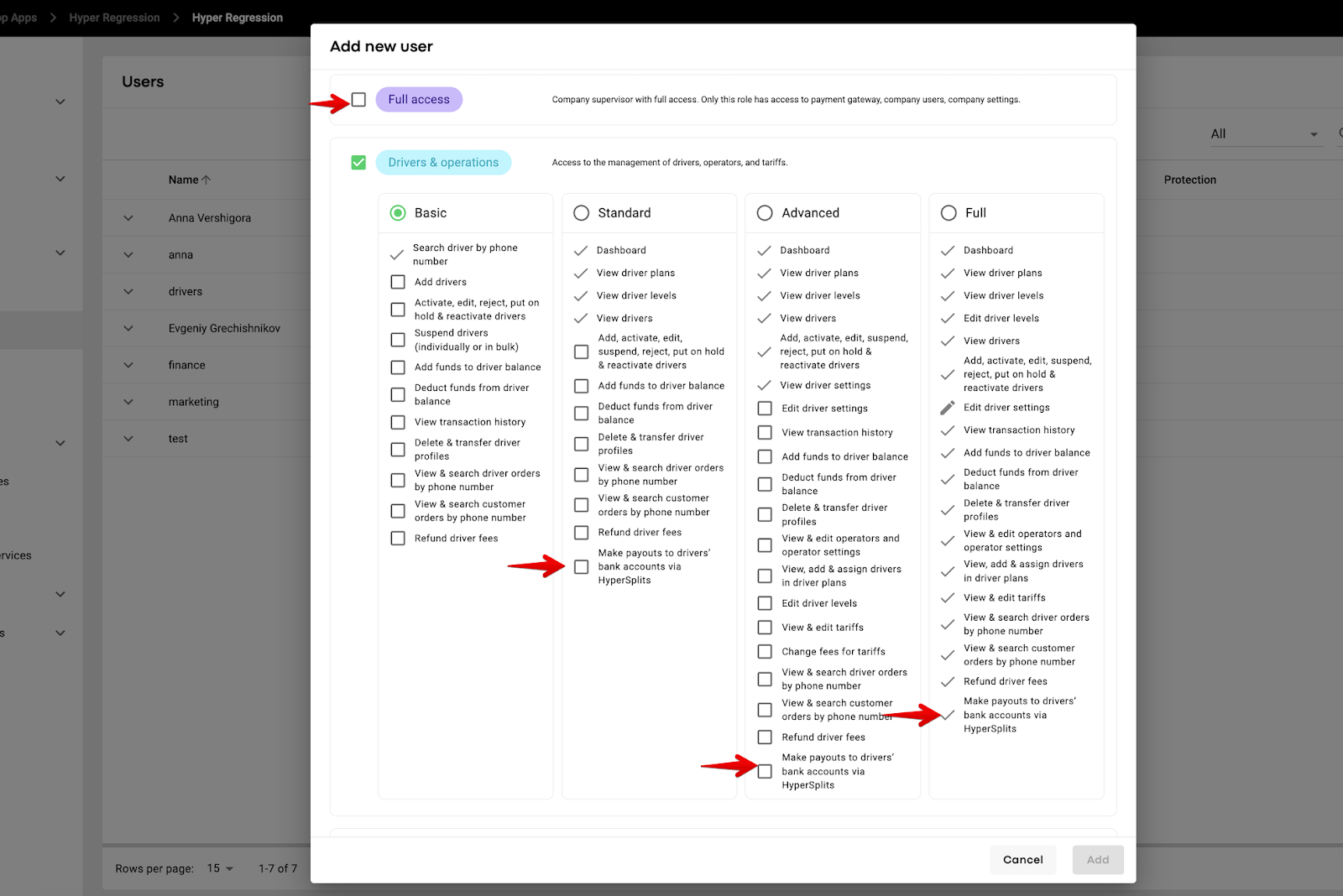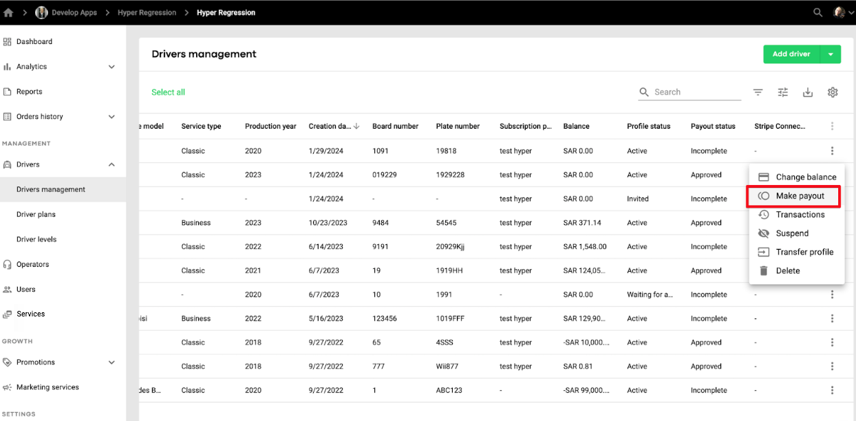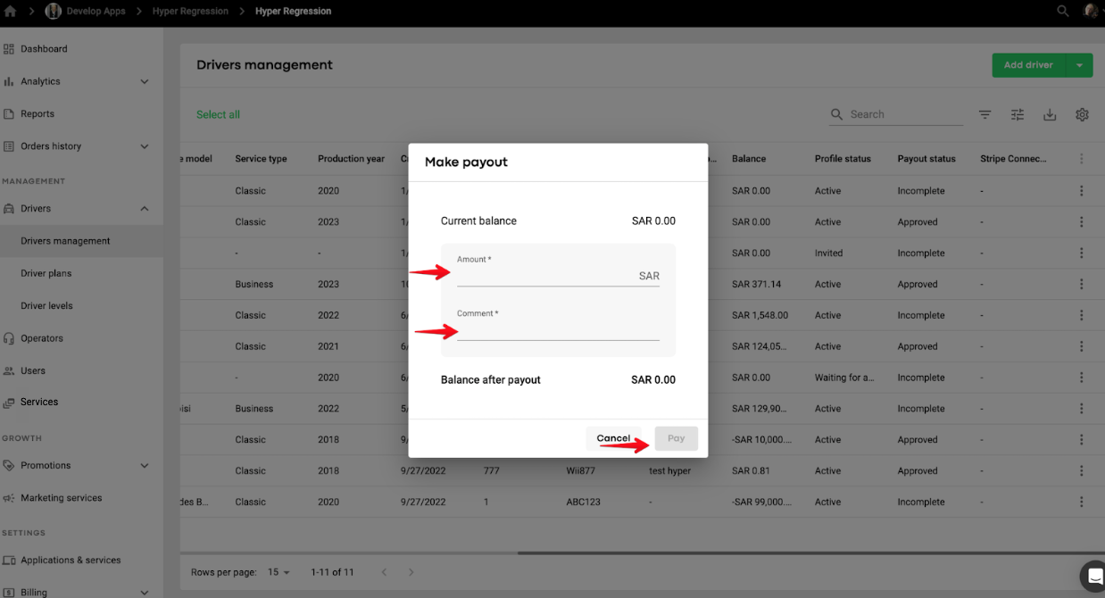 A Full access or Drivers and operations user (with the permission to affect HyperSplits payouts) should proceed to tab Drivers > Driver management > tap on the more items button by the profile of a driver who needs to be paid out > select “Make payout“ option > add the “Amount” for payout as well as a relevant comment and tap “Pay” to finalise.