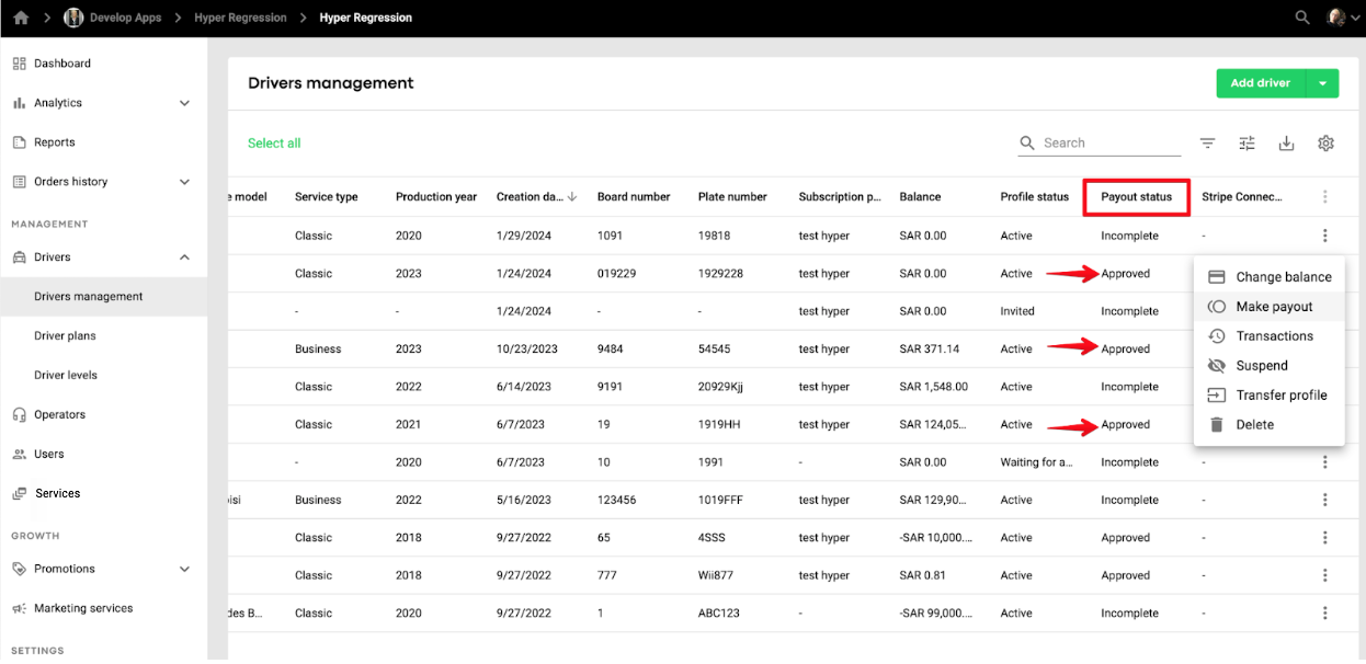 2. There is no option to process the payouts in bulk for multiple drivers with preset payout rules. Each payout is preceded by a manual action done by the manager.
