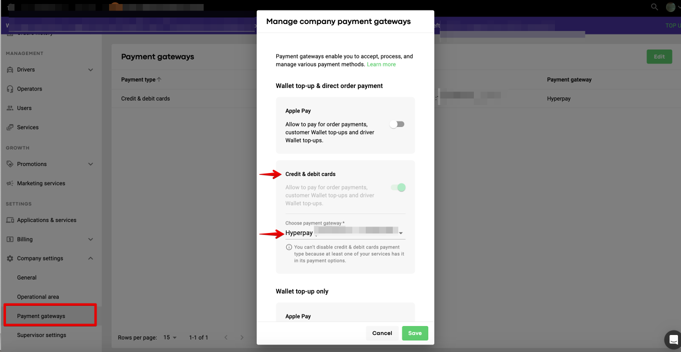c. Activate Hyperpay gateway in MyHub for required companies: My hub > Company settings > Payment gateways > specify "Hyperpay" for "Credit and debit cards".
