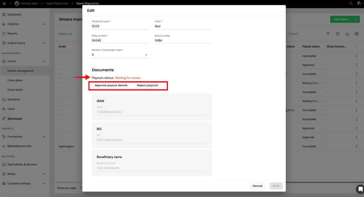 A Full access or Drivers and operations user (with the permission to edit driver profile) should proceed to tab Drivers > Driver management > filter drivers by “Active (waiting for review) status” > tap on a driver’s profile > hover over to Documents/Payout status: Waiting for review > review the data in the relevant field > tap Approve Payout details.
