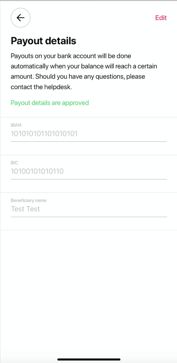access Side menu > tab Credit > Payout details > Add the required data into all the mandatory fields : IBAN, BIC, Beneficiary name > tap “Save”.