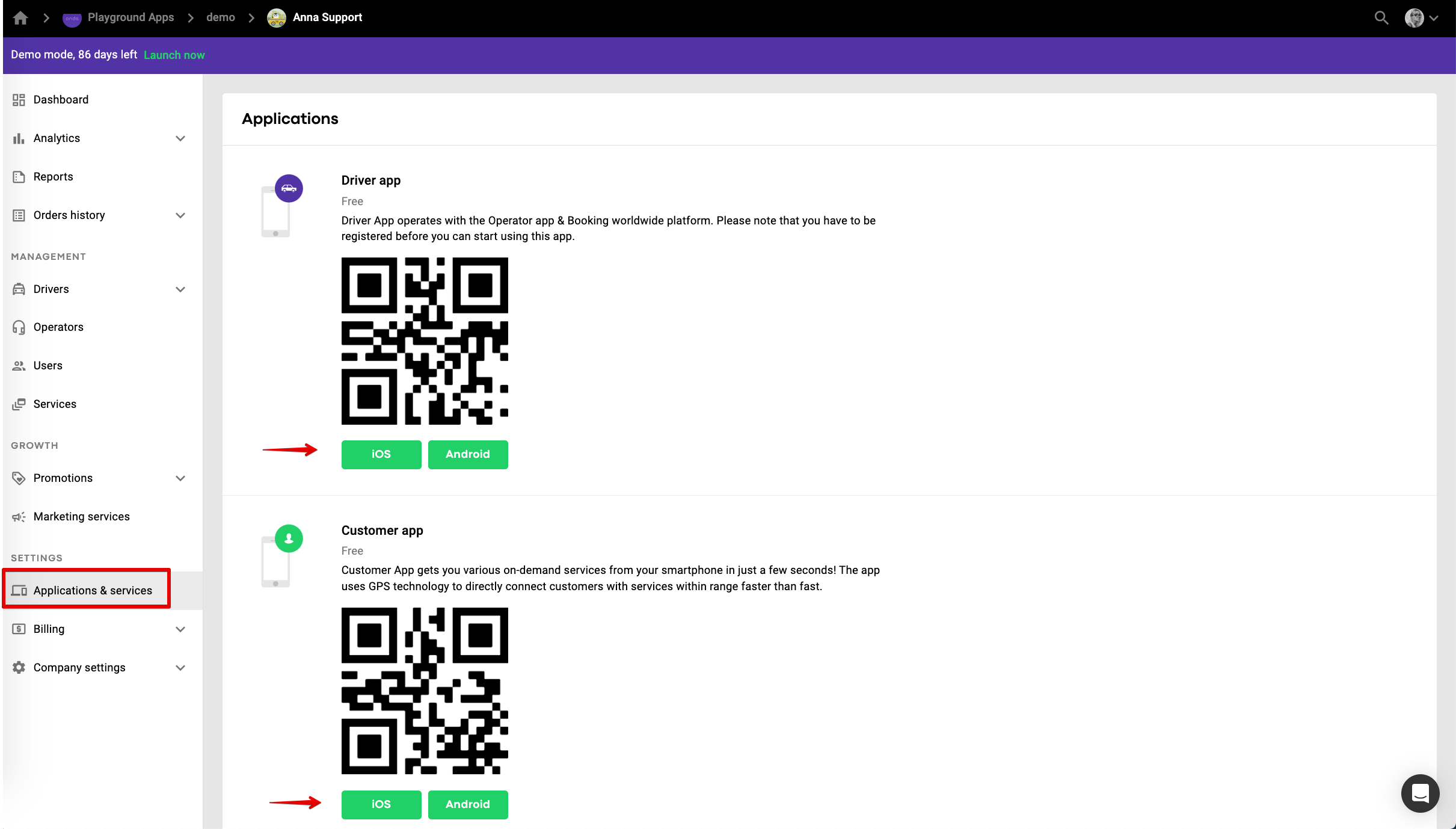 You can find the links to Customer and Driver DEMO apps in the tab Applications and services of My hub.