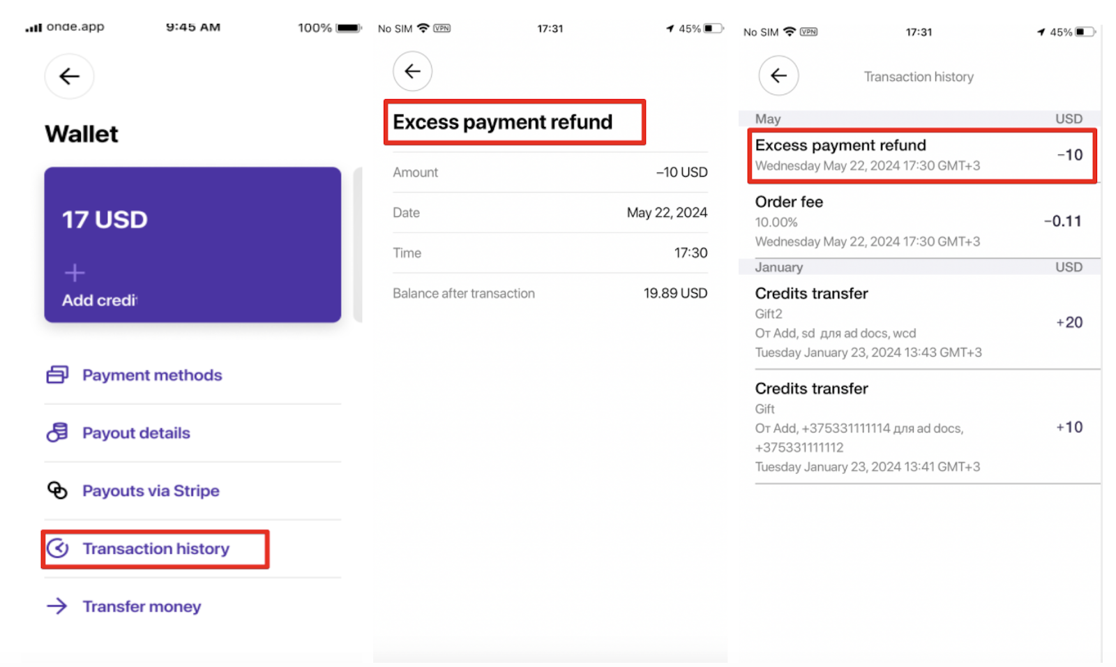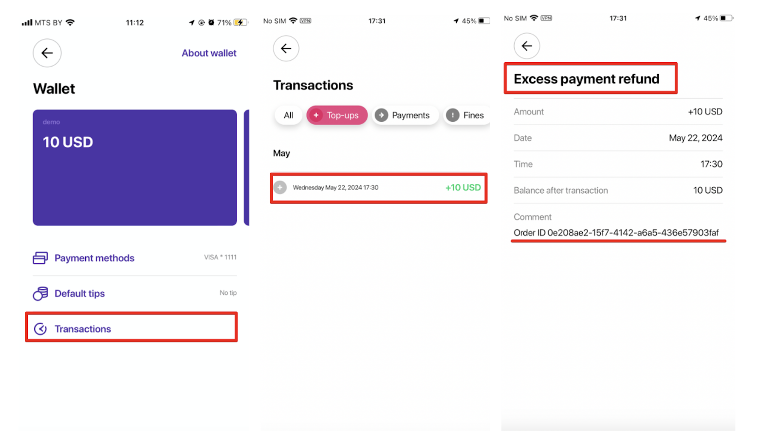 1.Driver Wallet transactions in Driver App and My hub profile. Category is “Credit Transfers”, transaction type is “Excess Payment Refund (debit)”.