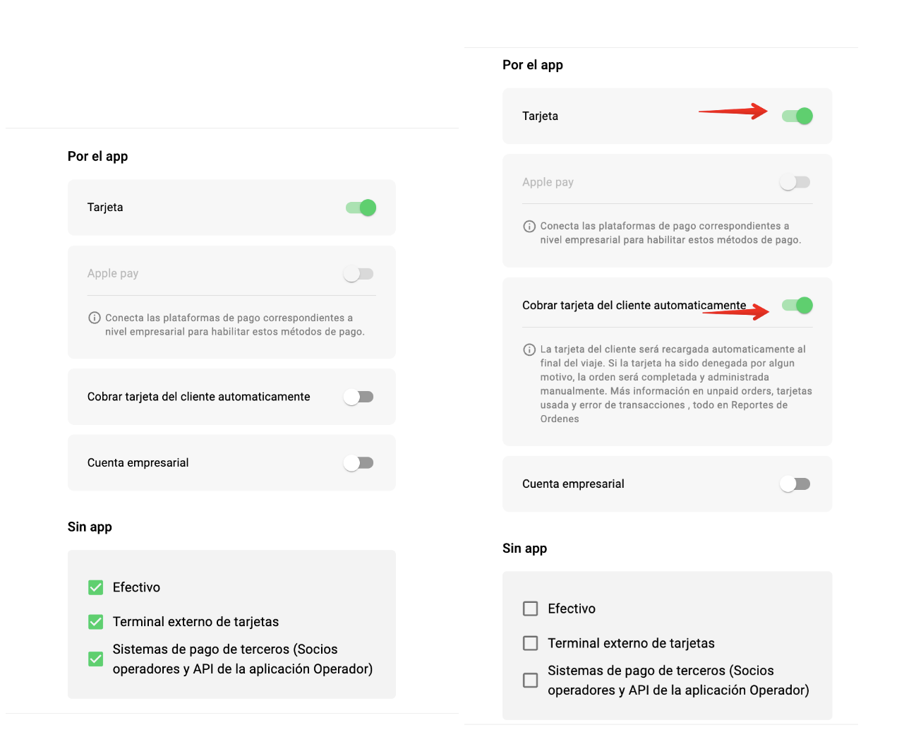 si el costo final del viaje es menor o igual a la suma preautorizada, el cargo por el viaje se realiza a partir de él y el valor en exceso se libera de nuevo a la tarjeta de crédito/Cartera del Cliente.