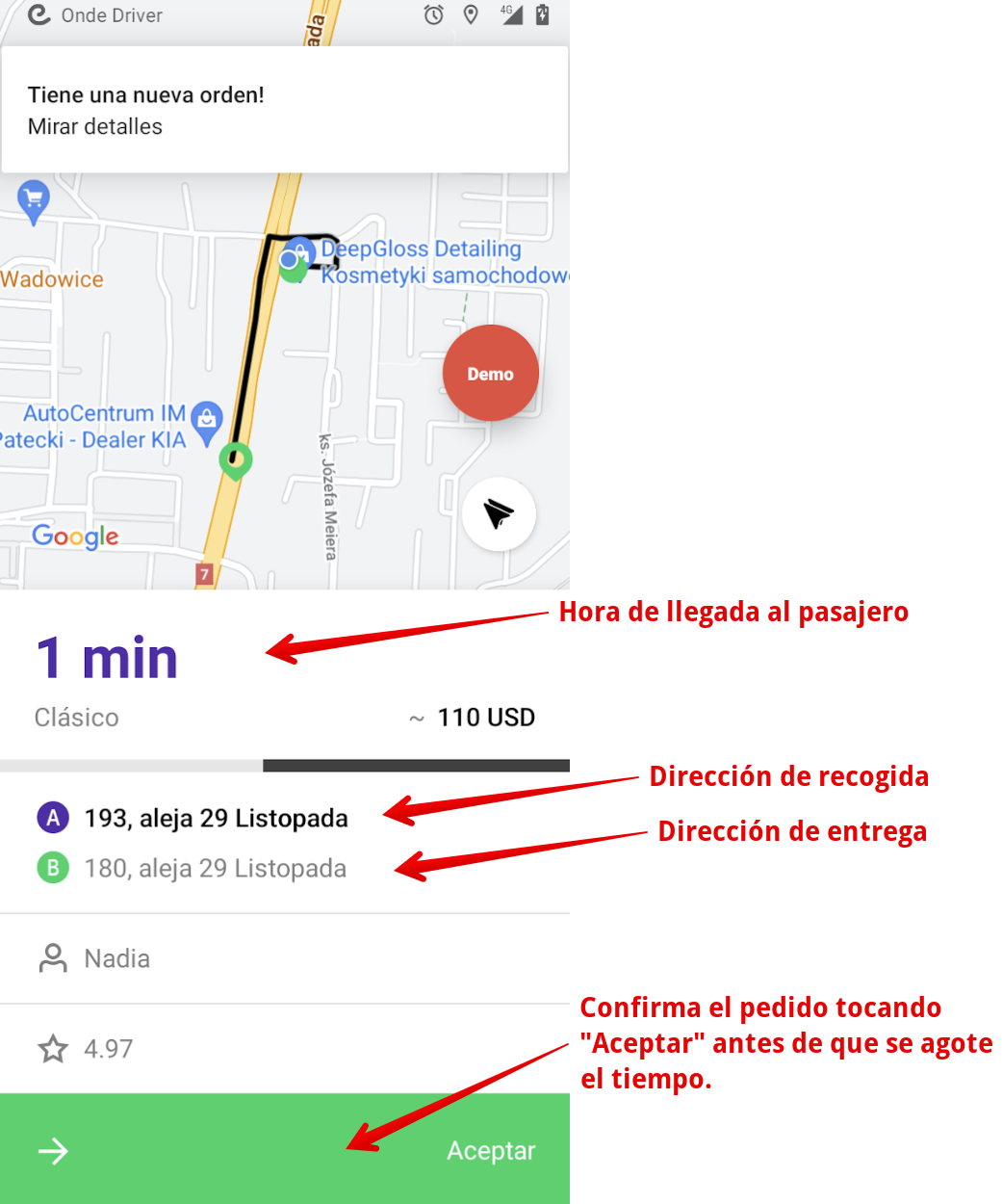 Cuando aparece una nueva orden, verás instantáneamente la ubicación de recogida del cliente. Toca "Aceptar" para recibir el viaje.