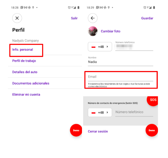 Por defecto, el correo electrónico es opcional para los conductores. No es requerido en el registro. El correo electrónico se puede agregar a través del menú lateral de la aplicación del conductor en Perfil > Información personal, si "Permitir a los conductores cambiar sus datos" está activado en la Configuración del conductor.