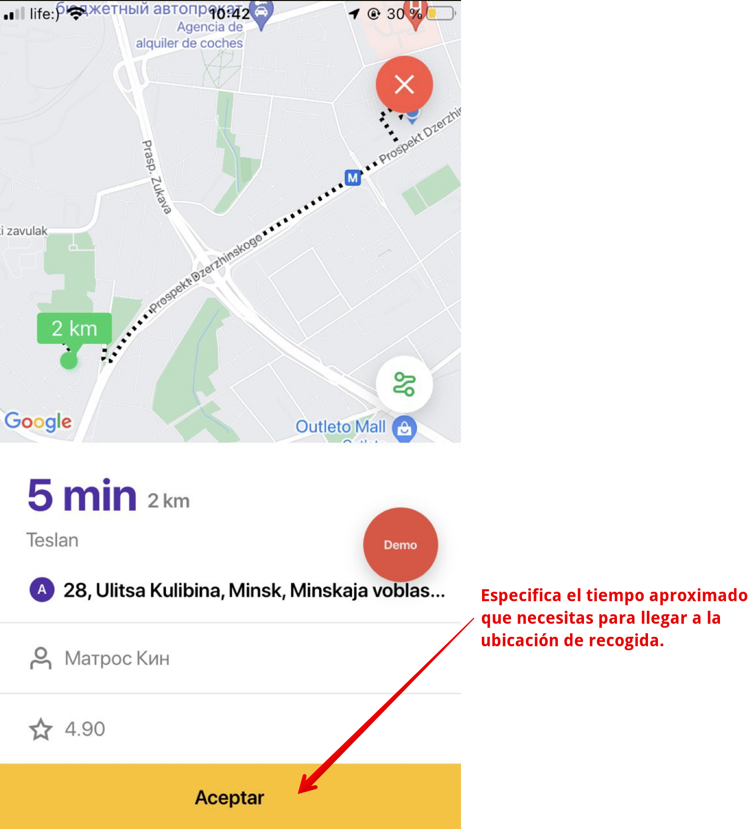 En caso de que el conductor no logre aceptar el trabajo entrante dentro de los 10 segundos, aún puede hacer una oferta ingresando el tiempo máximo en minutos que necesita para llegar a la ubicación de recogida.